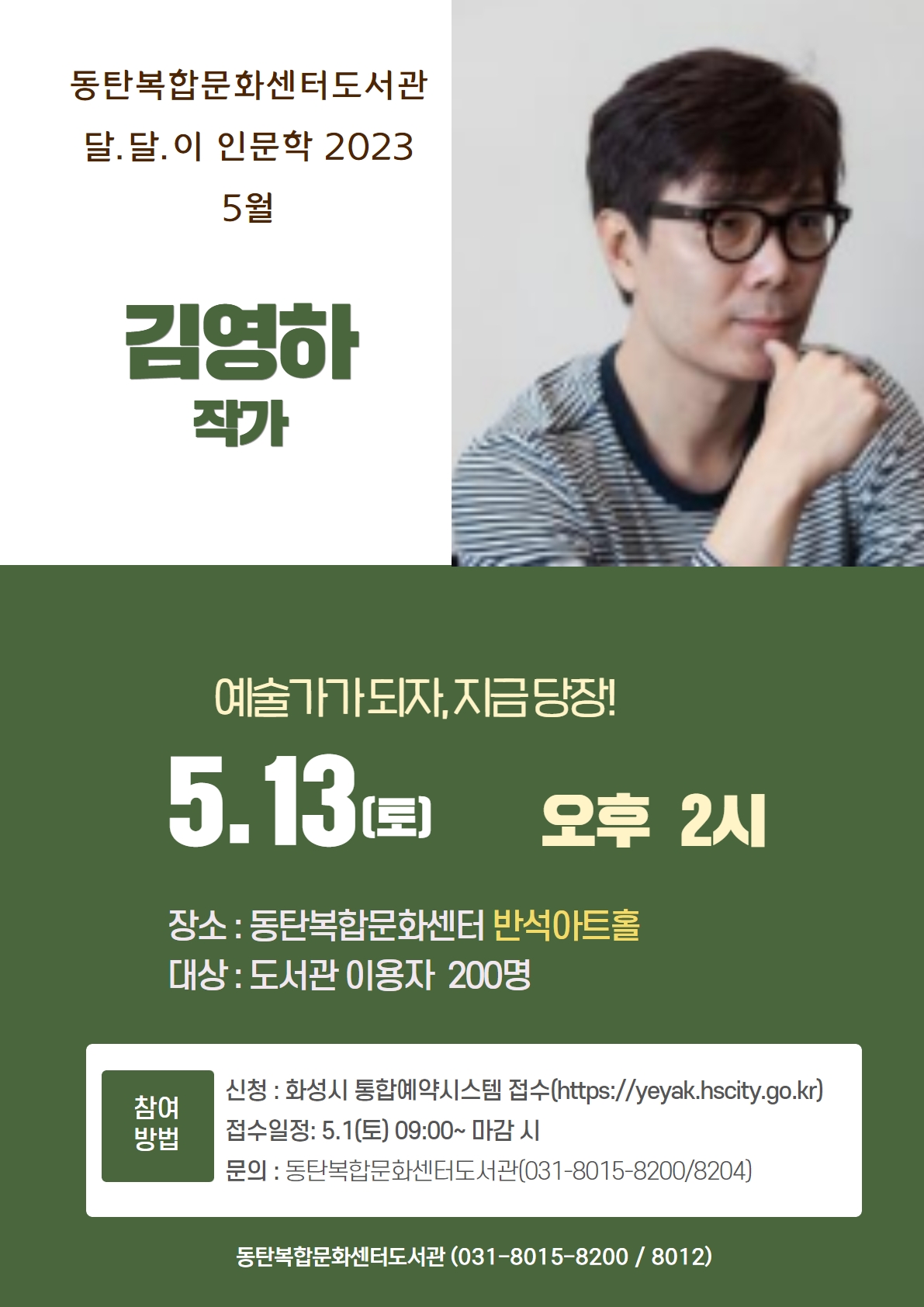 【[기 타] 행사】김영하 명사특강 "예술가가 되자, 지금당장!" 장소 반석아트홀 기간 2023년 5월 13일 ~ 2023년 5월 13일 요일 토 공연시간 14:00~15:30 티켓정보 관람등급 중학생이상 문의 동탄복합문화센터도서관 달.달.이 인문학 5월 행사 안내운영일시 : 5.13(토) 14:00~15:30운영대상 : 중학생 이상 시민 200명운영장소 : 반석아트홀 제목을 입력하세요 4.jpg [ Size : 423.87KB, Down : 86 ] 미리보기 다운로드 제목을 입력하세요 4 목록보기
