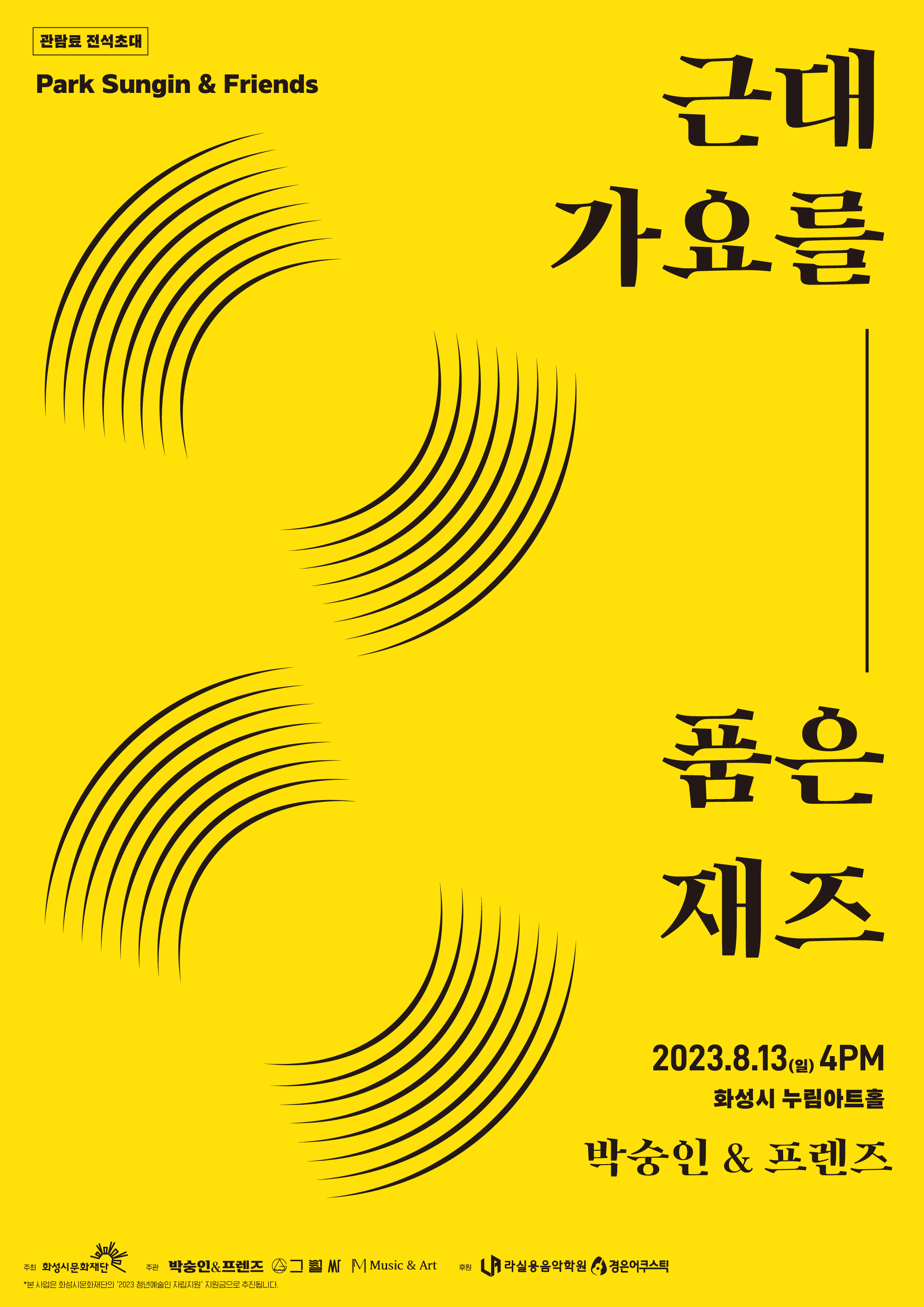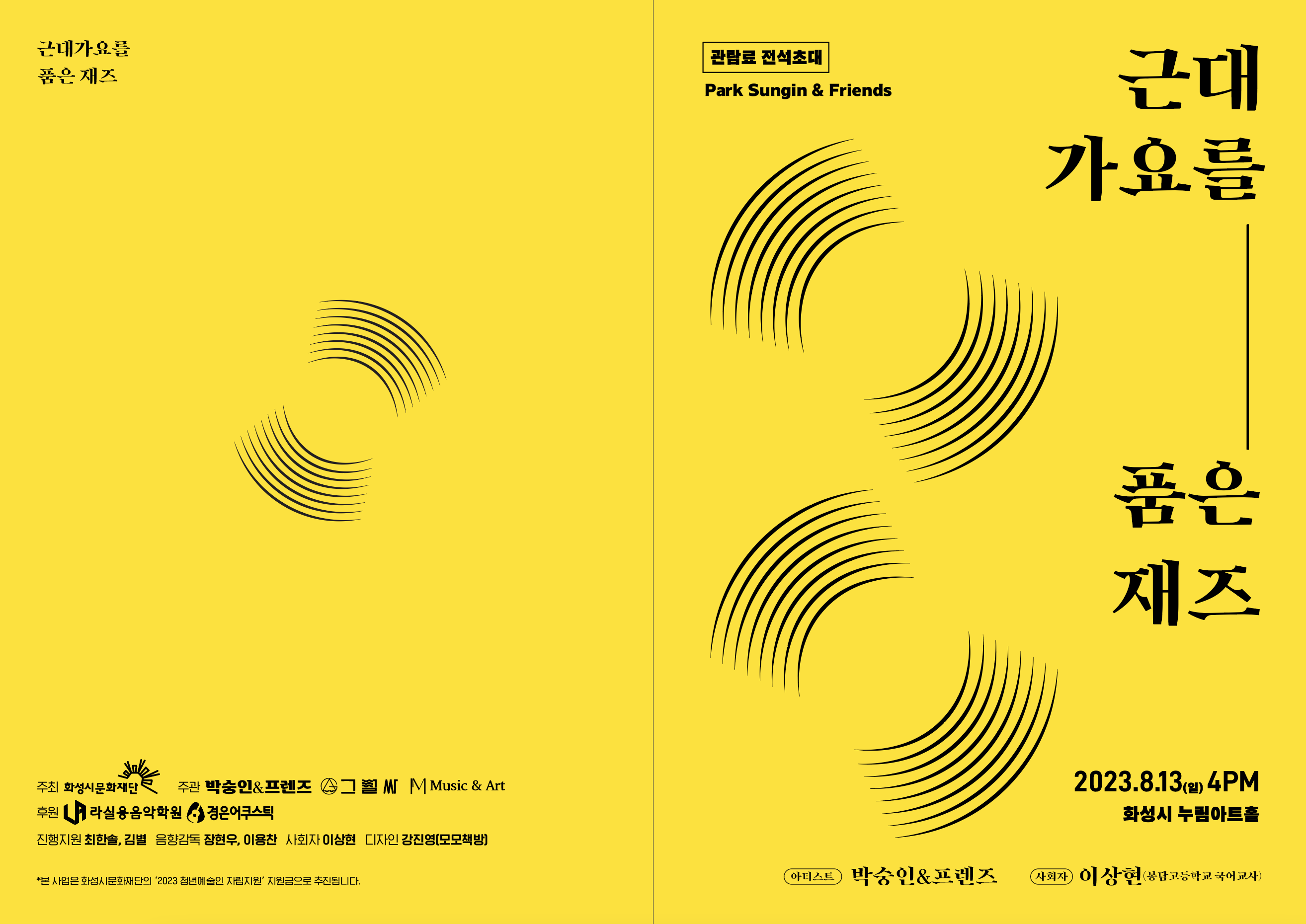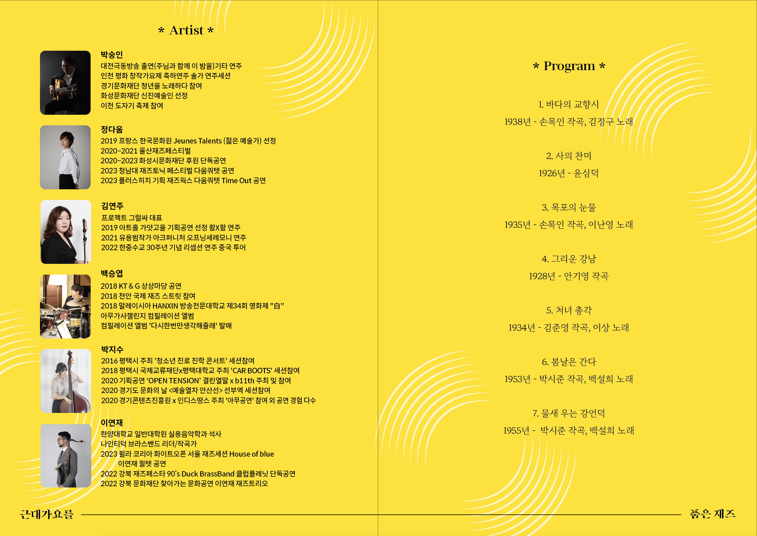 【[공 연]대관공연】근대가요를 품은 재즈 장소 모두누림센터 누림아트홀 기간 2023년 8월 13일 ~ 2023년 8월 13일 요일 일 공연시간 2023년 8월 13일(일) 16:00 (소요시간 80분) 티켓정보 전석 초대 관람등급 6세 이상 문의 010-2279-오구칠육 본 공연은 대관공연입니다.자세한 문의는 문의처로 바랍니다.예매링크 https://forms.gle/h2ukBudLUxxtAZUD9 선부역 세션참여 2020 경기콘텐츠진흥원 x 인디스땅스 주최 '아무공연' 참여 외 공연 경험 다수 이연재 한양대학교 일반대학원 실용음악학과 석사 나인티덕 브라스밴드 리더/작곡가 2023 휠라코리아 화이트오픈 서울 재즈세션 House of blue 이연재 퀄텟 공연 2022 강북 재즈페스타 90's Duck BrassBand 클럽플레닛 단독공연 2022 강북문화재단 찾아가는 문화공연 이연재 재즈트리오 * Program * 1. 바다의 교향시 1938년 - 손목인 작곡, 김정구 노래 2. 사의 찬미 1926년 - 윤심덕 3. 목포의 눈물 1935년 - 손목인 작곡, 이난영 노래 4. 그리운 강남 1928년 안기영 작곡 5. 처녀 총각 1934년 - 김준영 작곡, 이상 노래 6. 봄날은 간다 1953년 - 박시준 작곡, 백설희 노래 7. 물새 우는 강언덕 1955년 - 박시준 작곡, 백설희 노래 품은 재즈"> 목록이미지_박숭인.png [ Size : 7.23KB, Down : 921 ] 미리보기 다운로드 목록이미지_박숭인 포스터_박숭인 .jpg [ Size : 1.22MB, Down : 922 ] 미리보기 다운로드 포스터_박숭인 리플랫1.png [ Size : 503.62KB, Down : 934 ] 미리보기 다운로드 리플랫1 리플랫2.png [ Size : 1.06MB, Down : 987 ] 미리보기 다운로드 리플랫2 목록보기