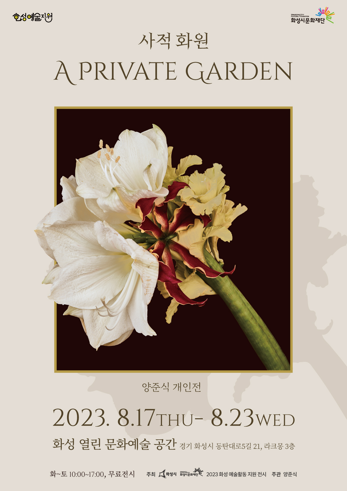 1. [화성예술지원] 양준식 개인 사진전 <사적 화원 展> ,장소:화성 열린 문화예술 공간 2전시실 (동탄대로 5길 21, 라크몽 3층) ,기간:2023년 8월 17일~2023년 8월 23일