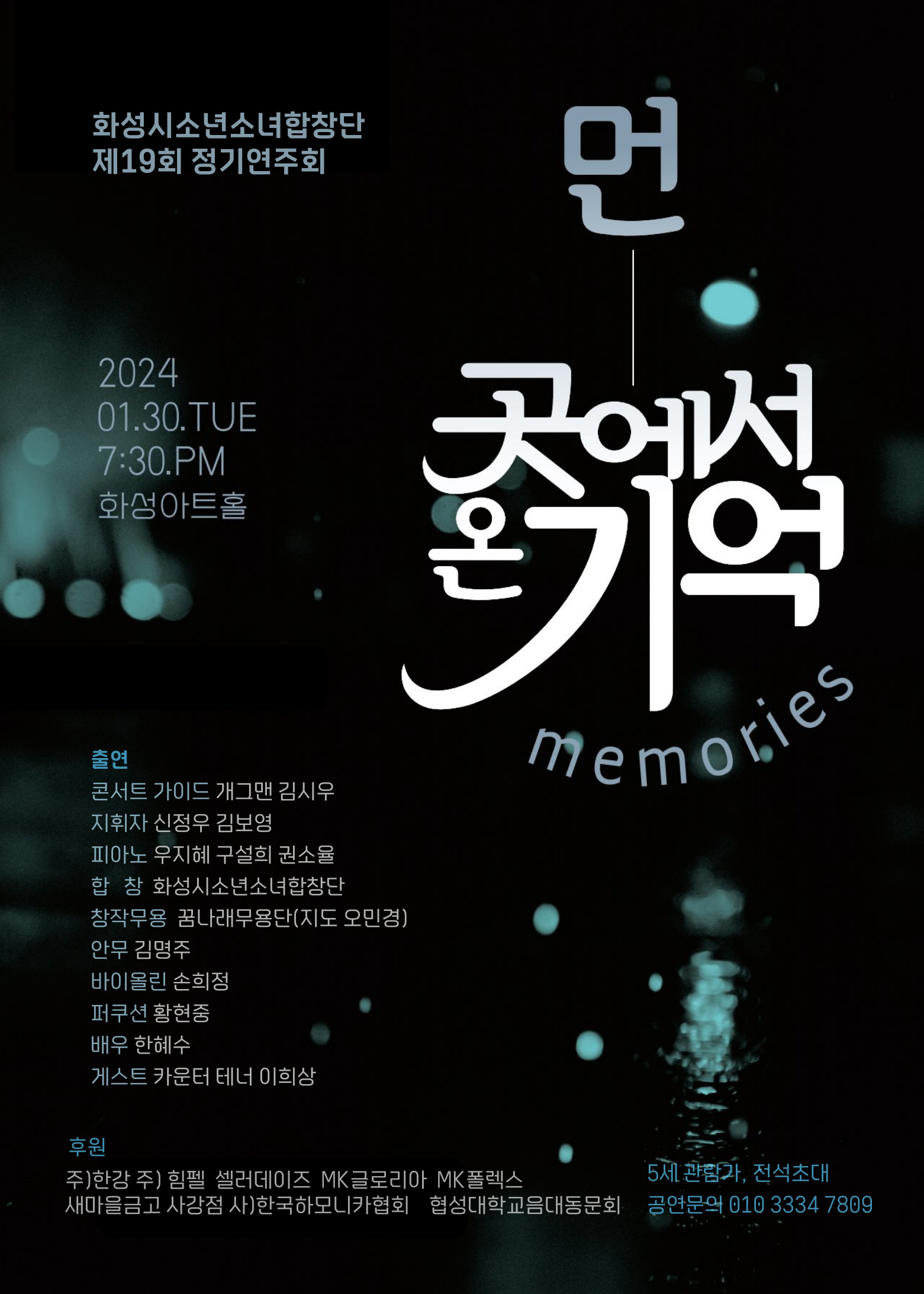 【[공 연]대관공연】제19회 화성시소년소녀합창단 정기연주회 장소 화성아트홀 기간 2024년 1월 30일 ~ 2024년 1월 30일 공연시간 19:30 / 총 70분 티켓정보 하기내용 참고 관람등급 만5세 관람가 문의 하기내용 참고 티켓문의 : 010 3334 **** KakaoTalk_20240123_110804701.jpg [ Size : 381.63KB, Down : 778 ] 미리보기 다운로드 KakaoTalk_20240123_110804701 KakaoTalk_20240123_110804701.jpg [ Size : 381.63KB, Down : 1,007 ] 미리보기 다운로드 KakaoTalk_20240123_110804701 목록보기