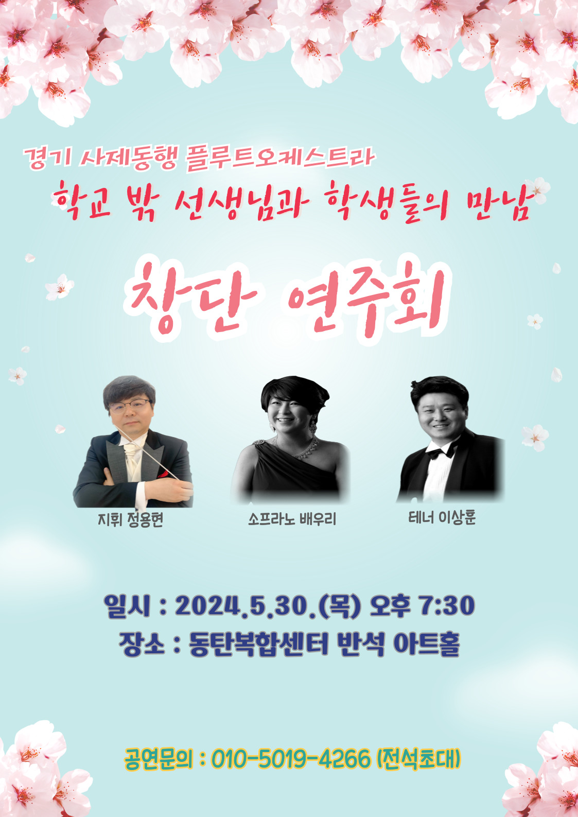 【[공 연]대관공연】 교실 밖 선생님과 학생들의 만남 - 경기 사제동행 플루트오케스트라 장소 동탄복합문화센터 반석아트홀 기간 2024년 5월 30일 ~ 2024년 5월 30일 요일 목 공연시간 19:30 티켓정보 전석 무료 관람등급 8세 이상 문의 010-5019-사이육육 많은 관심바랍니다. 창단홍보_인쇄,온라인홍보용포스터.jpg [ Size : 342.82KB, Down : 887 ] 미리보기 다운로드 창단홍보_인쇄,온라인홍보용포스터 창단홍보_인쇄,온라인홍보용포스터.jpg [ Size : 342.82KB, Down : 562 ] 미리보기 다운로드 창단홍보_인쇄,온라인홍보용포스터 목록보기