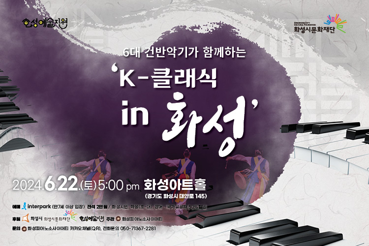 【[공 연]대관공연】6대 건반악기가 함께하는 ‘K-클래식 in 화성’ 장소 화성아트홀 기간 2024년 6월 22일 ~ 2024년 6월 22일 요일 토 공연시간 17:00 티켓정보 전석 2만원 관람등급 만 7세이상 문의 0507-1367-이이팔일 ▶예매바로가기◀ https://ticket.interpark.com/webzine/paper/TPNoticeView.asp?bbsno=34&no=51564 345.jpg [ Size : 139.34KB, Down : 577 ] 미리보기 다운로드 345 1718092775374.jpg [ Size : 1.04MB, Down : 1,040 ] 미리보기 다운로드 1718092775374 목록보기