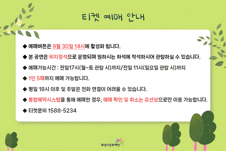 예매처 화성시문화재단 아트홀 홈페이지 art.hcf.or.kr