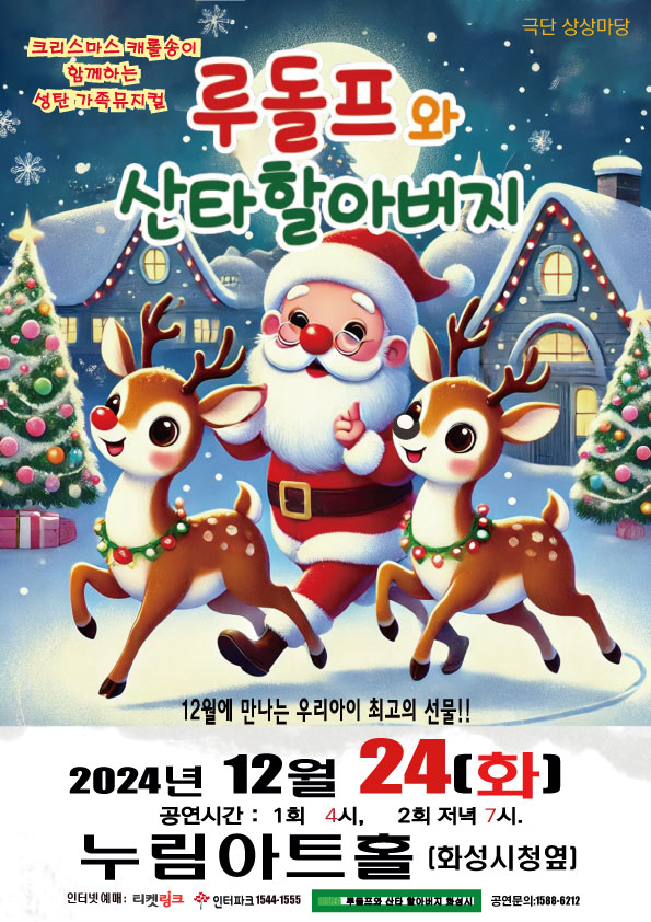 【[공 연]대관공연】루돌프와 산타할아버지 장소 모두누림센터 누림아트홀 기간 2024년 12월 24일 ~ 2024년 12월 24일 요일 화 공연시간 16:00 19:00 티켓정보 전석 4만원 관람등급 전체관람가 문의 1588-6212 많은 관심 바랍니다. 목록이미지.jpg [ Size : 14.31KB, Down : 332 ] 미리보기 다운로드 목록이미지 포스터.jpg [ Size : 158.68KB, Down : 326 ] 미리보기 다운로드 포스터 상세페이지.jpg [ Size : 4MB, Down : 893 ] 미리보기 다운로드 상세페이지 목록보기