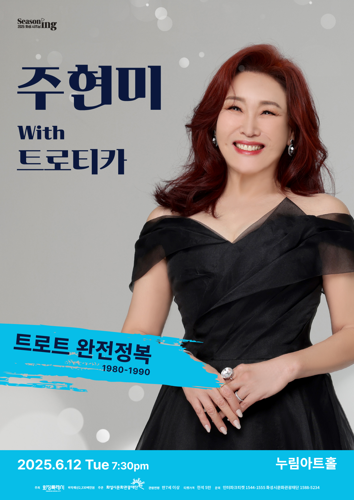 【[공 연]기획공연】주현미 with 트로티카 <트로트 완전정복2> 장소 누림아트홀 기간 2025년 6월 12일 ~ 2025년 6월 12일 요일 목 공연시간 19:30(80분) 티켓정보 전석 5만원 관람등급 만 7세 이상 관람가 문의 1588-5234 ※예매 바로가기 버튼은 2월 4일(화) 16시에 활성화됩니다. (06.12)주현미2_아트홀목록.jpg [ Size : 98.02KB, Down : 448 ] 미리보기 다운로드 (06.12)주현미2_아트홀목록 (25.06.12) 주현미 with 트로티카.jpg [ Size : 1.04MB, Down : 508 ] 미리보기 다운로드 (25.06.12) 주현미 with 트로티카 ㅈㅜㅎㅕㄴㅁㅣ2_ㅅㅏㅇㅅㅔㅍㅔㅇㅣㅈㅣ_ㅊㅚㅈㅗㅇ.jpg [ Size : 2.71MB, Down : 4,329 ] 미리보기 다운로드 ㅈㅜㅎㅕㄴㅁㅣ2_ㅅㅏㅇㅅㅔㅍㅔㅇㅣㅈㅣ_ㅊㅚㅈㅗㅇ 목록보기
