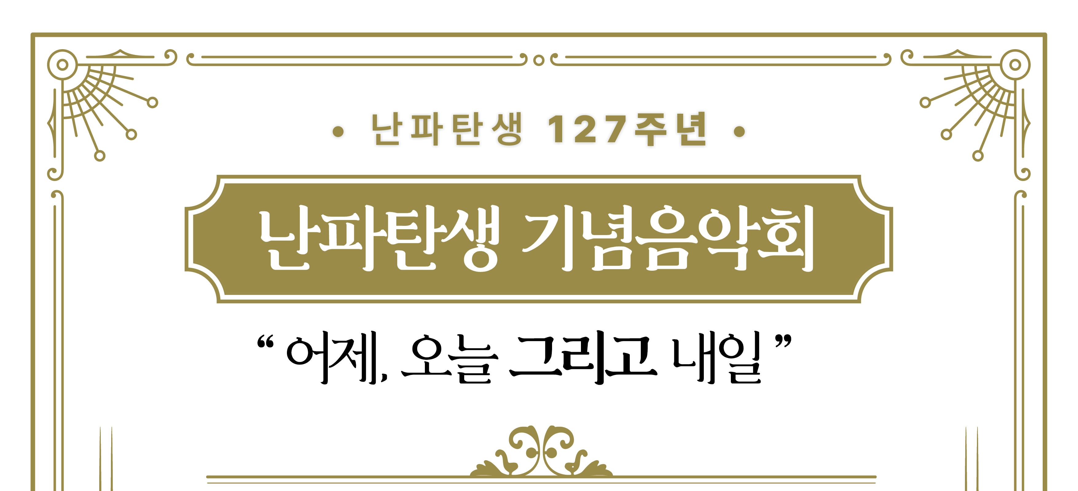 【[공 연]대관공연】 난파탄생 127주년 난파탄생 기념음악회 “어제, 오늘 그리고 내일” 장소 모두누림센터 누림아트홀 기간 2025년 4월 26일 ~ 2025년 4월 26일 요일 토 공연시간 2025년 4월 26일(토) 17:00 (소요시간: 80분(인터미션 없음)) 티켓정보 전석 무료 관람등급 6세 이상 입장 가능 문의 010-3426-칠팔팔팔 화성음협 사이트에서 예매 가능https://hsmusic.modoo.at/?link=6khzrsgl 난파탄생음악회 목록이미지.png [ Size : 274.87KB, Down : 158 ] 미리보기 다운로드 난파탄생음악회 목록이미지 2025 난파탄생음악회.png [ Size : 4.68MB, Down : 245 ] 미리보기 다운로드 2025 난파탄생음악회 목록보기