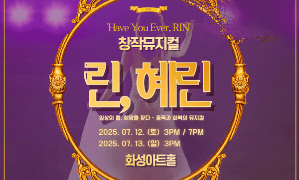 【[공 연]대관공연】뮤지컬 <린, 혜린> 장소 유앤아이센터 화성아트홀 기간 2025년 7월 12일 ~ 2025년 7월 13일 요일 토, 일 공연시간 2025년 7월 12일(토) 15:00, 19:00, 13일(일) 15:00 (소요시간 100분) 티켓정보 전석 무료, 사전등록 필요 관람등급 12세 이상 문의 031-354-6614 예매 링크https://www.playticket.co.kr/nav/detail.html?idx=3655 목록이미지_린, 혜린.jpg [ Size : 234.71KB, Down : 77 ] 미리보기 다운로드 목록이미지_린, 혜린 포스터.jpg [ Size : 166.99KB, Down : 427 ] 미리보기 다운로드 포스터 목록보기