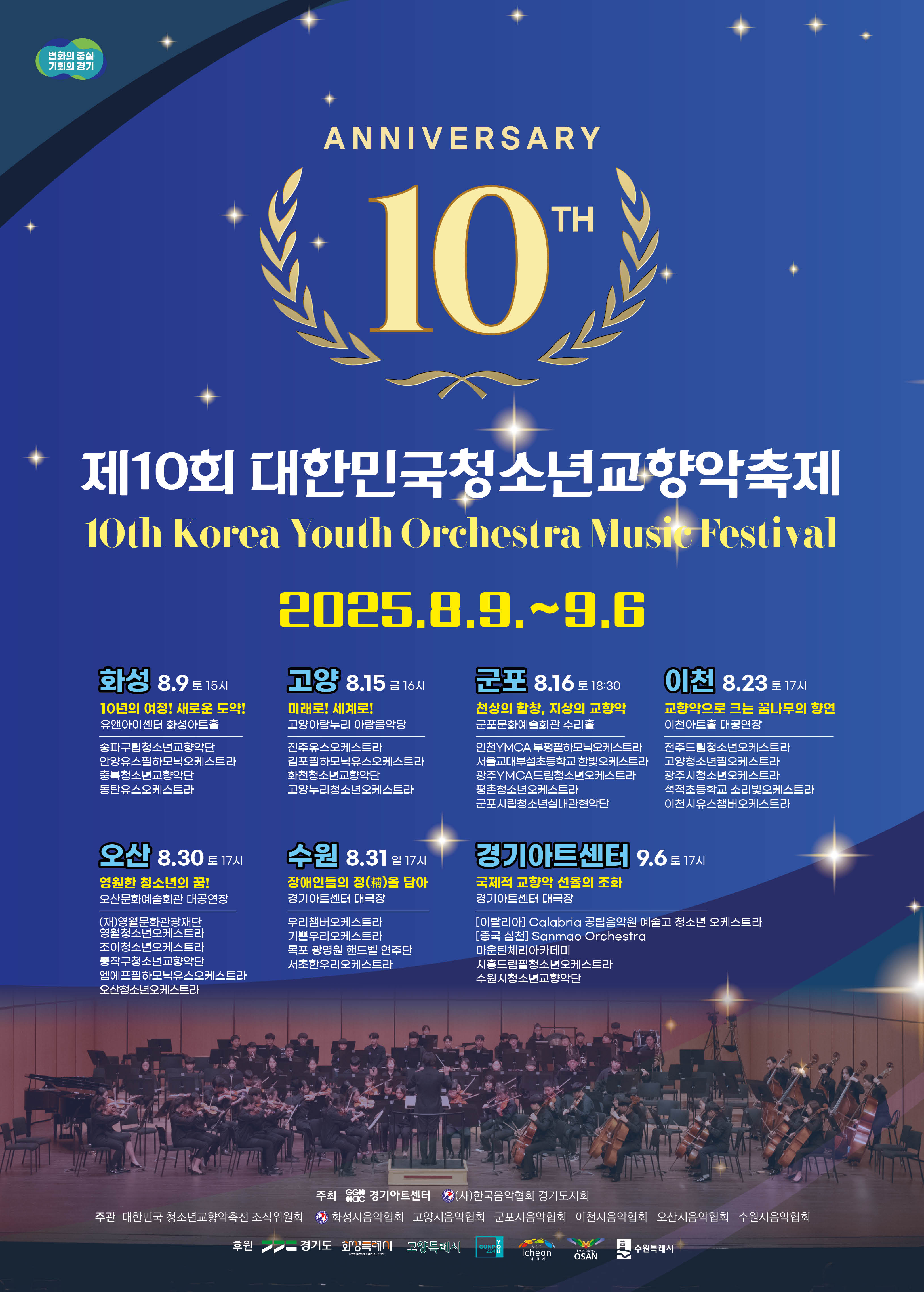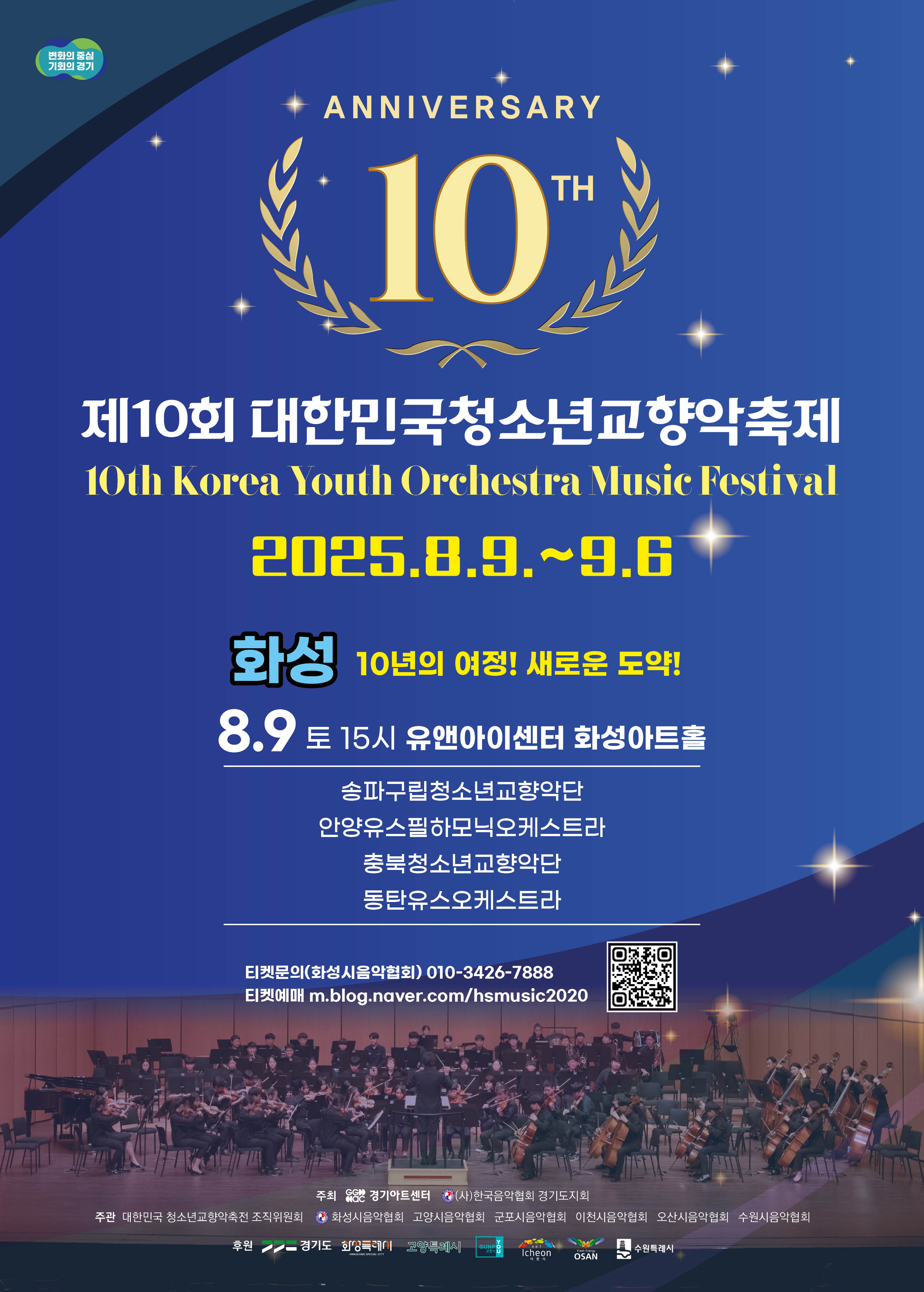 【[공 연]대관공연】제10회 대한민국청소년교향악축제 장소 화성아트홀 기간 2025년 8월 9일 ~ 2025년 8월 9일 요일 토 공연시간 15:00 티켓정보 네이버폼(https://naver.me/5pqeUQ2B)에서 예매 가능 관람등급 전체 문의 010-3426-칠팔팔팔 문의: 010-3426-칠팔팔팔예매: https://naver.me/5pqeUQ2B [대관] 목록이미지 기본형.jpg [ Size : 24.67KB, Down : 88 ] 미리보기 다운로드 [대관] 목록이미지 기본형 KakaoTalk_20250711_122146017.jpg [ Size : 916.39KB, Down : 82 ] 미리보기 다운로드 KakaoTalk_20250711_122146017 KakaoTalk_20250711_122146017_01.jpg [ Size : 1.06MB, Down : 149 ] 미리보기 다운로드 KakaoTalk_20250711_122146017_01 목록보기