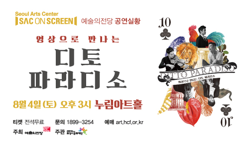 【[공 연]기획공연】SAC on Screen 디토 파라디소 `디토 10주년 갈라 콘서트` 장소 누림아트홀 기간 2018년 8월 4일 ~ 2018년 8월 4일 공연시간 15:00 티켓정보 무료 관람등급 만7세 이상 문의 1899-3254 SAC on Screen 디토 파라디소 `디토 10주년 갈라 콘서트` 예매하기 177397 홈피기본.jpg [ Size : 79.91KB, Down : 469 ] 미리보기 다운로드 177397 상세페이지.jpg [ Size : 1.29MB, Down : 1,310 ] 미리보기 다운로드 목록보기