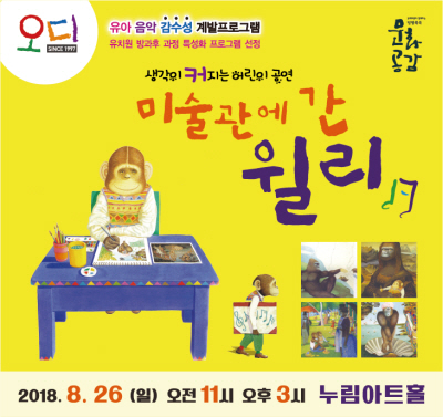 【[공 연]기획공연】미술관에 간 윌리 장소 모두누림센터 누림아트홀 기간 2018년 8월 26일 ~ 2018년 8월 26일 공연시간 오전 11시, 오후 3시 티켓정보 전석 1만원 관람등급 만24개월 이상 문의 1899-3254 . 미술관에간윌리1.jpg [ Size : 126.4KB, Down : 451 ] 미리보기 다운로드 미술관에간윌리2.jpg [ Size : 1.35MB, Down : 3,139 ] 미리보기 다운로드 목록보기