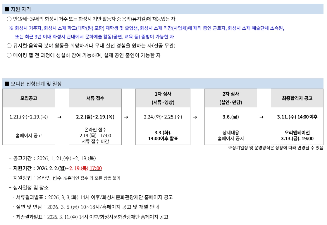 [2026 라이징스타: 메이킹 랩]은 뮤지컬 및 음악극 분야에 잠재력 있는 시민을 발굴하여 전문적인 트레이닝부터 무대 실연까지 지원하는 프로젝트입니다. (재)화성시문화관광재단과 함께 꿈의 무대를 만들어갈 역량있는 시민 여러분의 많은 관심과 참여 바랍니다.