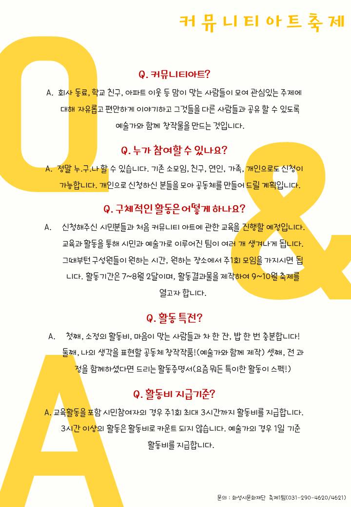(재)화성시문화재단 축제1팀에서는 관내 예술가와 함께 2021년 커뮤니티아트축제를 진행 하고자 아래와 같이 예술가를 모집합니다.