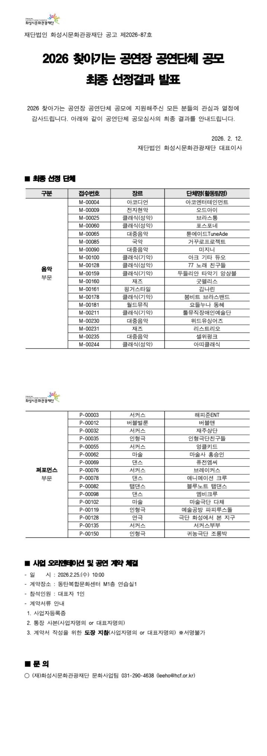 2026 찾아가는 공연장 공연단체 공모 최종 선정결과 공고 작성자 관리자 작성일 2026년 2월 12일 13시 40분 38초 조회 78 2026 찾아가는 공연장 공모심사 최종 선정결과 공고.jpg [ Size : 545.96KB, Down : 147 ] 미리보기 다운로드 2026 찾아가는 공연장 공모심사 최종 선정결과 공고 목록보기