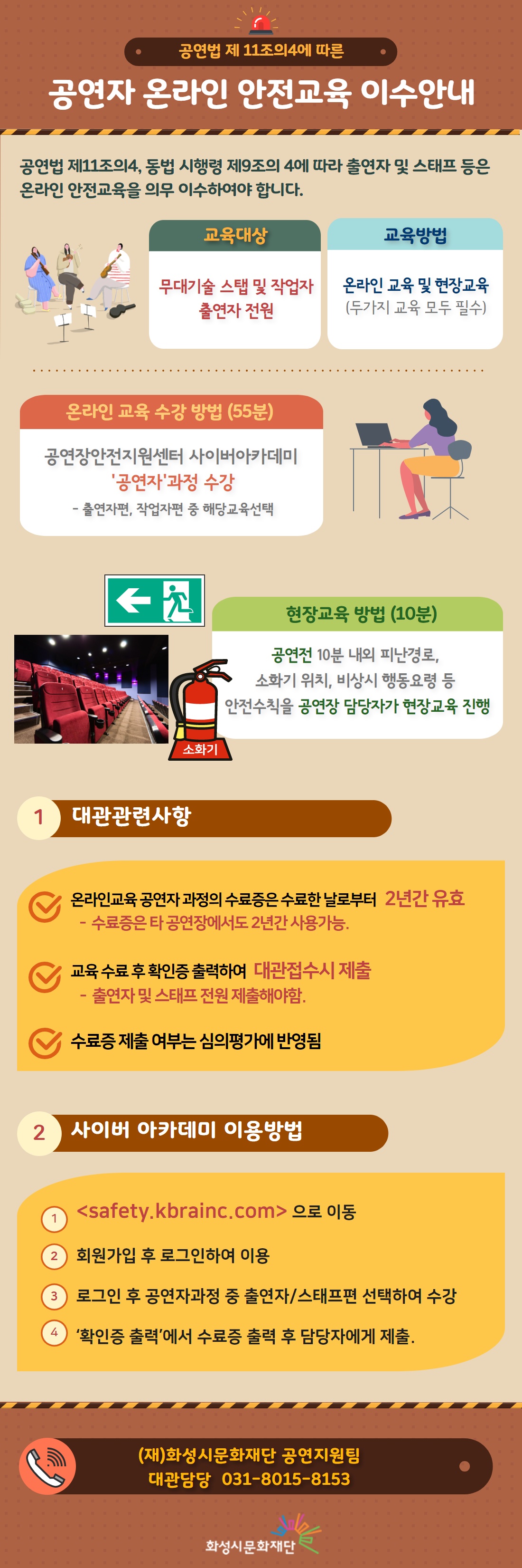 [공연장 대관자 필독사항] 공연법에 따른 온라인 안전교육 수강안내 작성자 관리자 작성일 2018년 11월 2일 16시 50분 8초 조회 1,284 온라인안전교육.jpg [ Size : 698.59KB, Down : 313 ] 미리보기 다운로드 공연자 안전교육 온라인 수강 .pdf [ Size : 56.06KB, Down : 411 ] 다운로드 목록보기