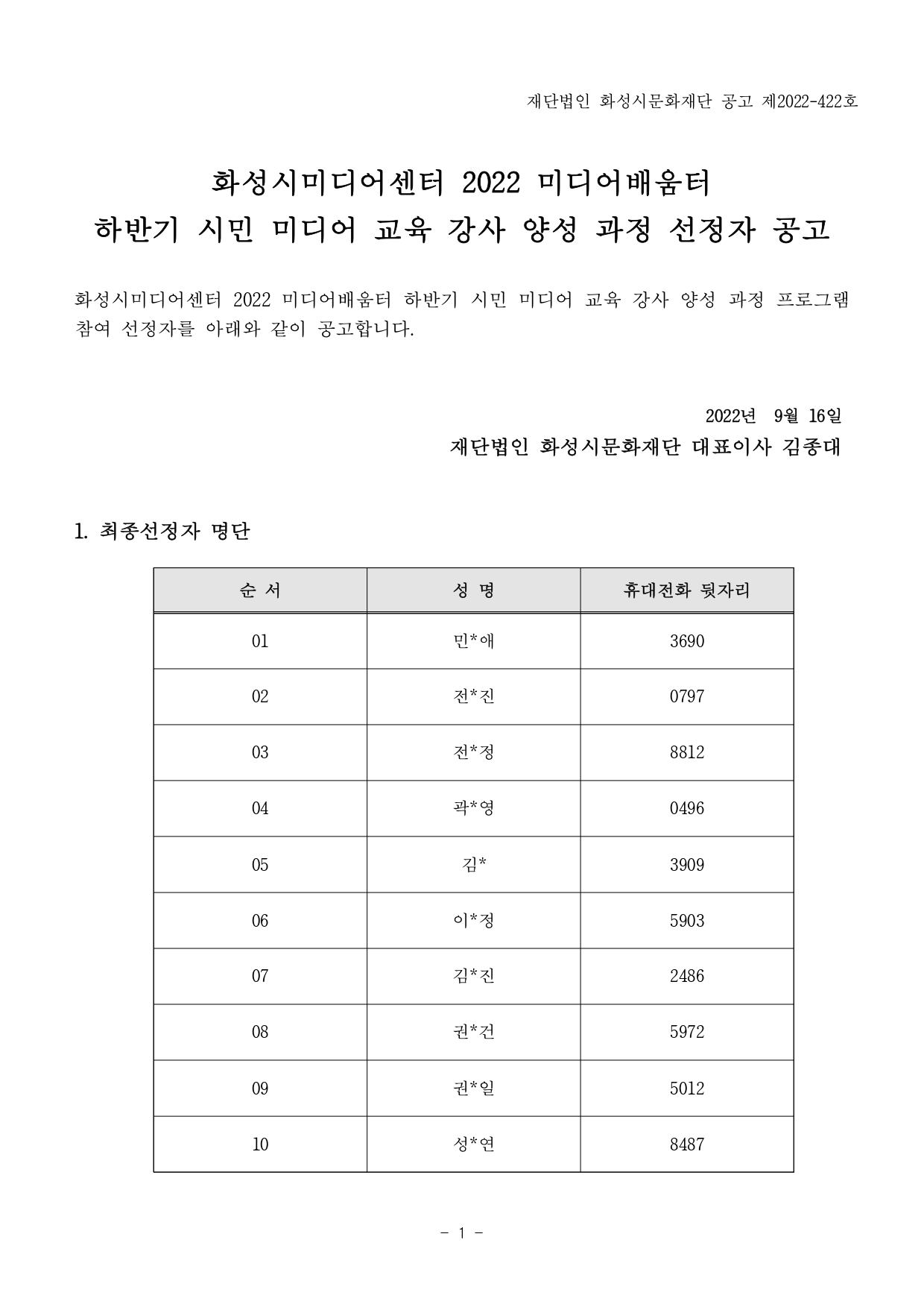 [붙임1] 2022 미디어배움터 하반기 시민 미디어 교육 강사 양성 과정 선정자 공고_page-0001