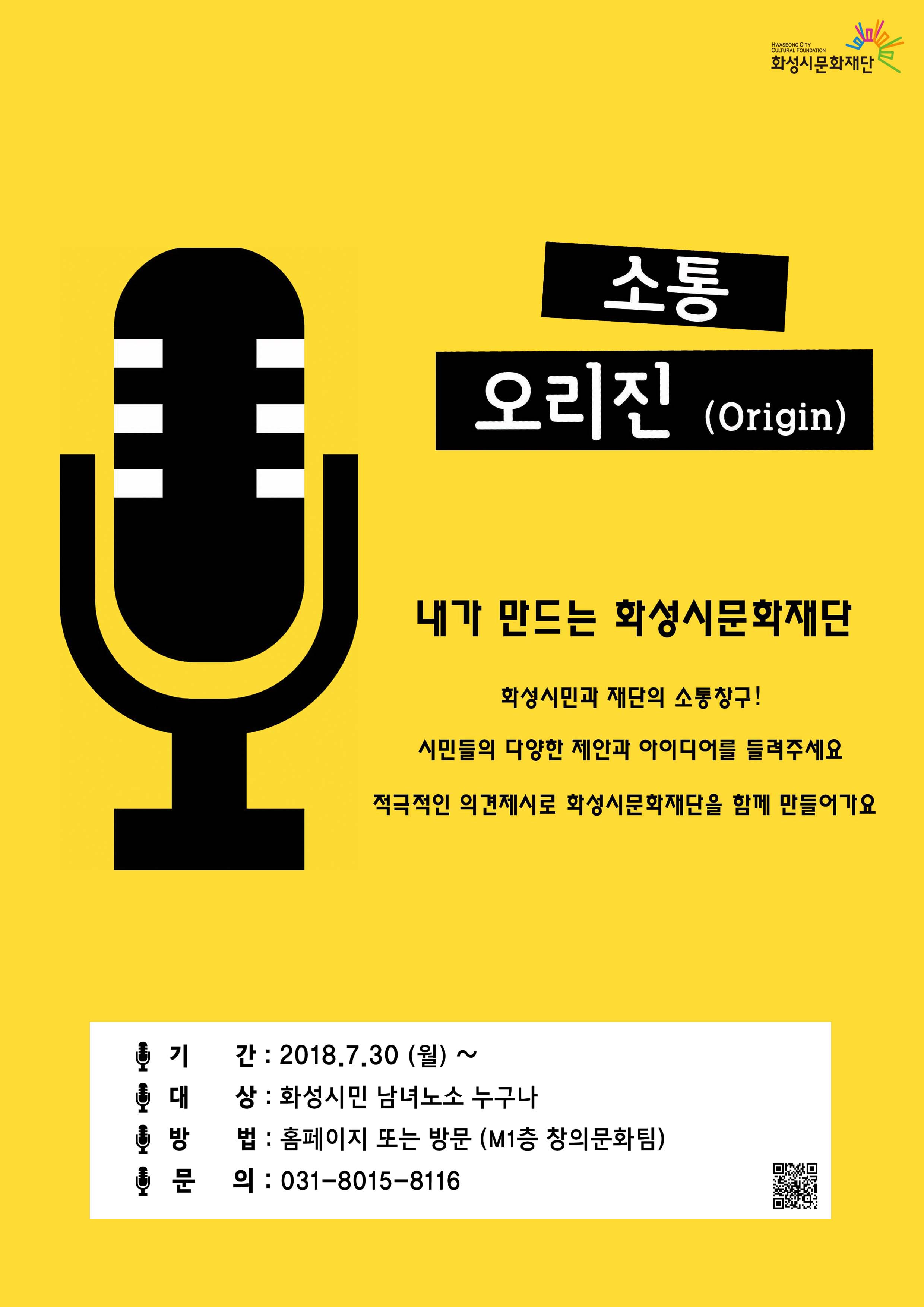 (재)화성시문화재단(대표이사 권영후)은 7월 30일부터 재단에 바라는 시민들의 의견을 듣는 직접적 소통창구 「소통 오리진(origin)」을 운영한다.
