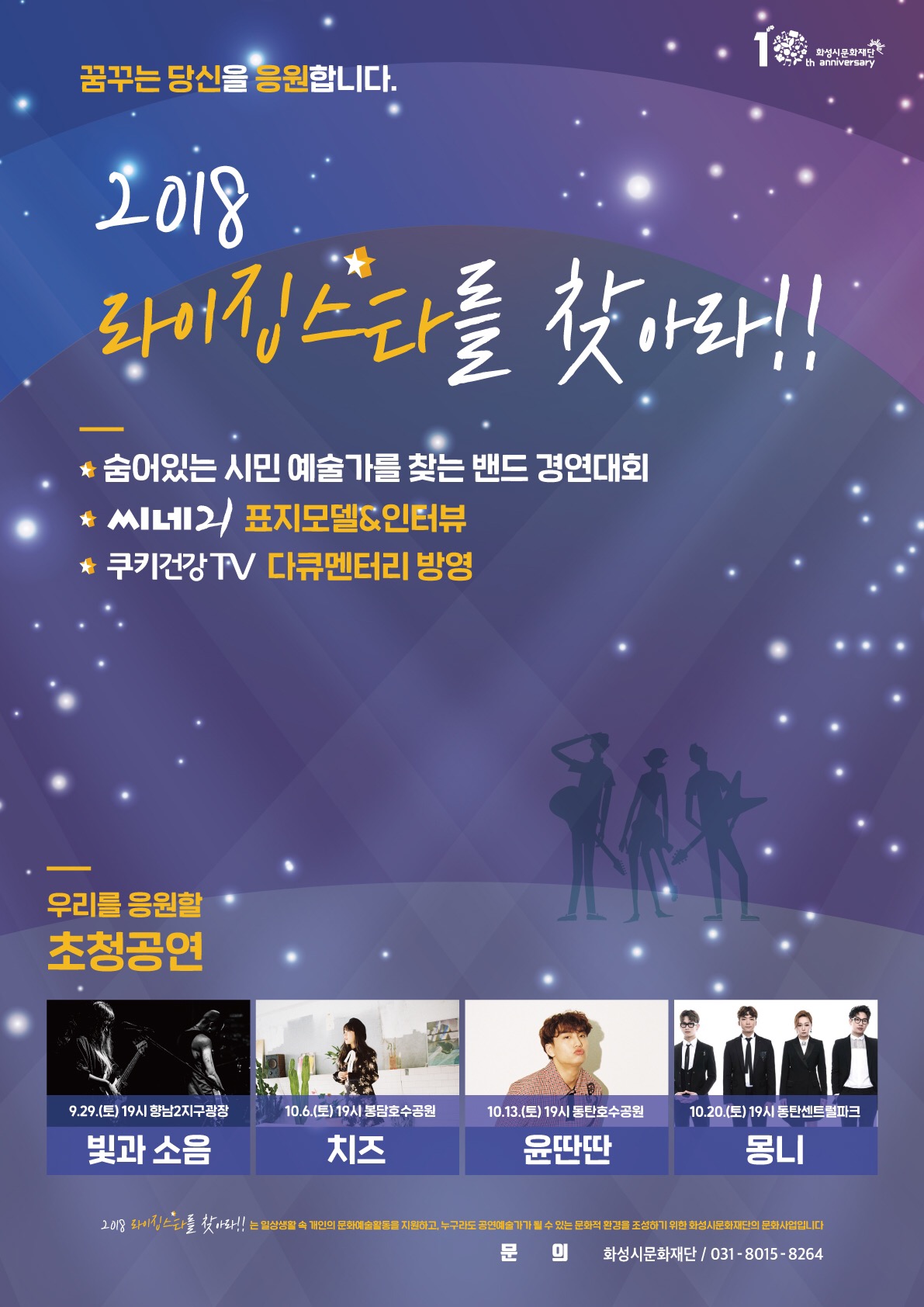 (재)화성시문화재단(대표이사 권영후)에서 주최하는 밴드경연대회 <2018 라이징스타를 찾아라>의 참가신청이 마감되었다. 8월 1일부터 26일까지 이루어진 지원 기간 동안 총 112개 팀이 지원하였다. 만 18세 이상, 3인 이상으로 구성된 팀만 지원이 가능했음에도 불구하고, 많은 밴드가 참여해 <라이징 스타를 찾아라>에 대한 관심과 기대를 짐작할 수 있다.