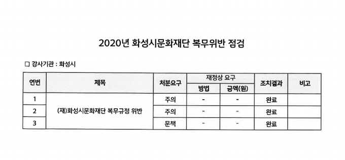 2020년 화성시문화재단 복무위반 점검 결과 작성자 관리자 작성일 2021년 3월 5일 16시 49분 5초 조회 161 2020년 화성시문화재단 복무규정위반 점검.png [ Size : 65.87KB, Down : 153 ] 미리보기 다운로드 목록보기