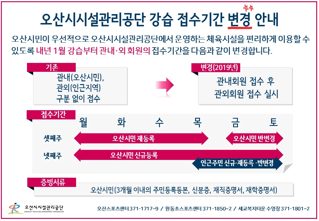 게시판 취지와 관계없는 불법정보 게시, 타인 비방, 광고성 글 등은 예고없이 삭제될 수 있습니다. 동탄복합문화센터 수영강습 늘려주세요 작성자 길호정 작성일 2018년 12월 4일 12시 12분 50초 조회 425 오산스포츠센터.jpg [ Size : 170.41KB, Down : 225 ] 미리보기 다운로드 동탄에 자리가 없어서 오산으로 다니고 있는데 오산스포츠센터 1월부터 오산시민 우선으로 등록후 남는자리를 타지역민에게 배정한다고 합니다. 그렇게 되면 동탄시민은 동탄에서만 강습을 받아야하는데 지금 강습은 너무 부족합니다. 실력등급별로 한반정도 더 운영하셨으면 좋겠습니다. 목록보기