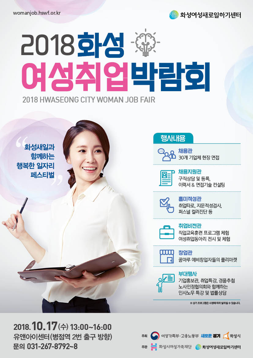 【[기 타] 행사】2018화성 여성취업 박람회 장소 유앤아이센터 기간 2018년 10월 17일 ~ 2018년 10월 17일 공연시간 13:00-16:00 티켓정보 관람등급 문의 267-8792~8 . 2018 화성 여성취업박람회 전단지.jpg [ Size : 119KB, Down : 395 ] 미리보기 다운로드 목록보기