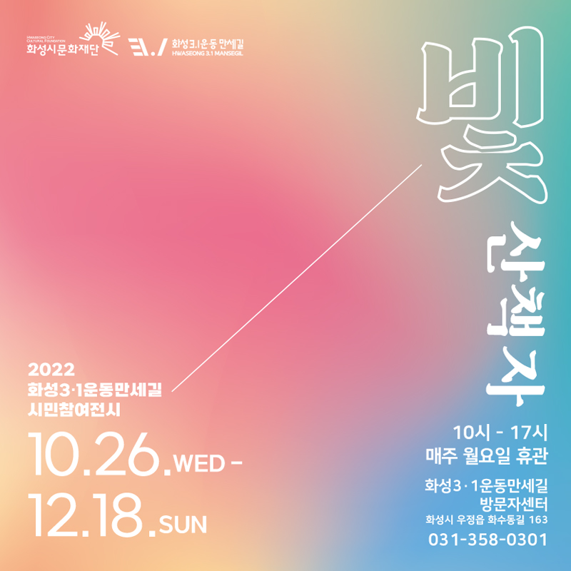 1. 화성3.1운동만세길 방문자센터 시민참여전시<빛 산책자>,장소:화성3·1운동만세길 방문자센터 (화성시 우정읍 화수동길 163),기간:2022년 10월 26일~2022년 12월 18일