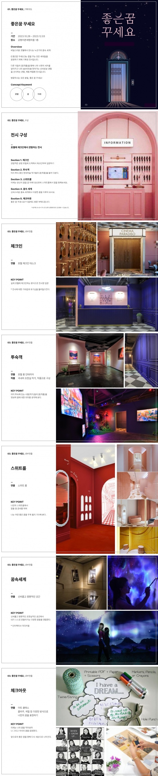 비밀스러운 호텔에서 만나는 누군가의 꿈속 세계 좋은꿈 꾸세요는 꿈을 꾸는 모든 세대들을 응원하기 위해 기획된 전시입니다. 다른 이들의 꿈작품을 통해 나의 내면의 세계를 알아가고 나의 꿈을 찾아가는 신비로운 경험을 선사하는 관람 체험 복합형 전시입니다. 방문하시는 모든 분들 좋은 꿈 꾸세요!