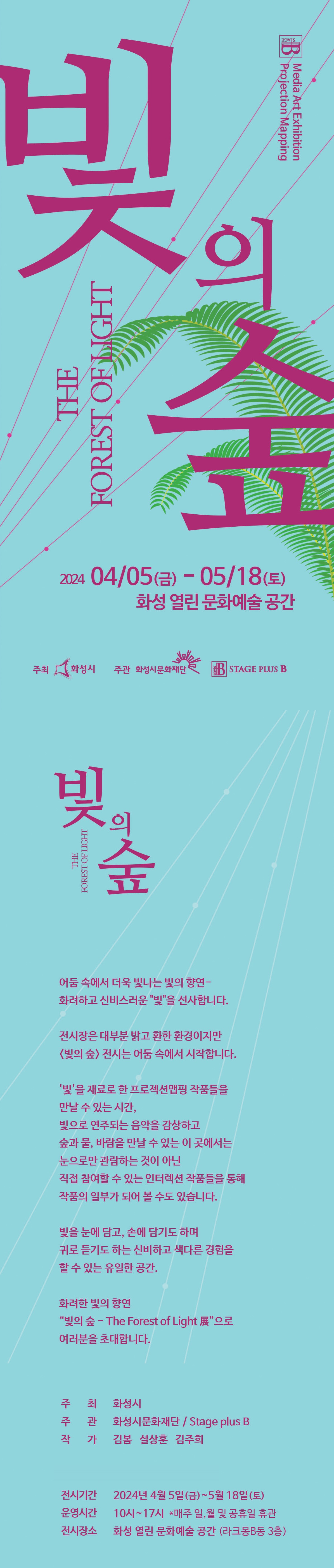 1. 화성 열린 문화예술 공간 기획전시<빛의 숲>,장소:화성시 동탄대로 5길 21, 라크몽 B동 3층, 화성 열린 문화예술 공간,기간:2024년 4월 5일~2024년 5월 18일