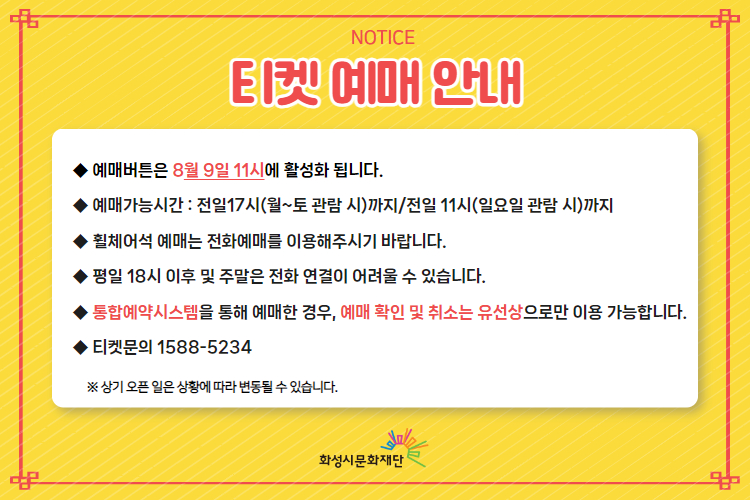 예매 화성시문화재단 www.hcf.or.kr 1588-5234 인터파크 티켓 1544-1555 연령 만 13세 이상 관람가 전석 1만원