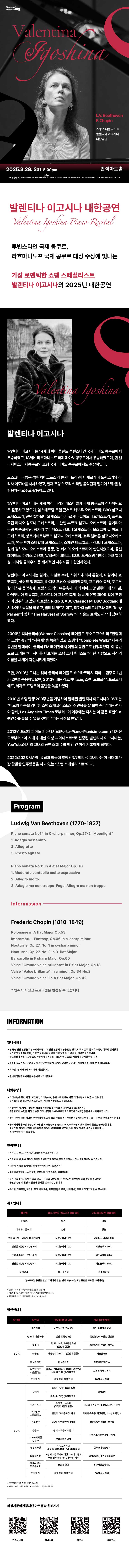 1. 쇼팽 스페셜리스트 <발렌티나 이고시나 내한공연>,장소:,기간:2025년 3월 29일~2025년 3월 29일