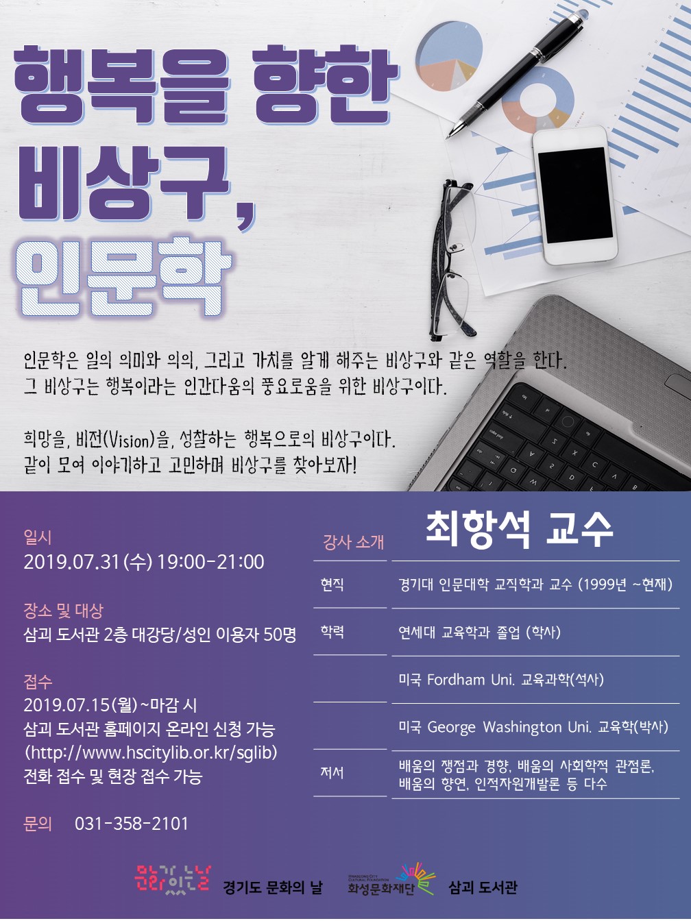 【[기 타] 행사】행복을 향한 비상구, 인문학 장소 삼괴도서관 2층대강당 기간 2019년 7월 31일 ~ 2019년 7월 31일 공연시간 19:00~21:00 티켓정보 관람등급 전체 문의 031-358-2101 행복을 향한 비상구, 인문학http://www.hscitylib.or.kr/lectureView.do?LIBCODE=SGLIB&LECTCODE=cult&pageNo=1&idx=9326 행복인문학.png [ Size : 44.88KB, Down : 176 ] 미리보기 다운로드 행복을향한인문학비상구.JPG [ Size : 281.53KB, Down : 204 ] 미리보기 다운로드 행복을향한인문학비상구.JPG [ Size : 281.53KB, Down : 253 ] 미리보기 다운로드 목록보기
