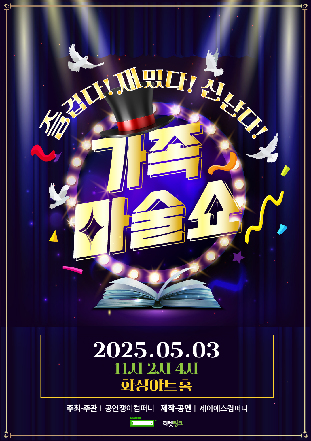 【[공 연]대관공연】가족마술쇼 장소 화성아트홀 기간 2025년 5월 3일 ~ 2025년 5월 3일 요일 토 공연시간 11:00, 14:00, 16:00 티켓정보 전석 2만원 관람등급 24개월 이상 문의 070-8080-일삼삼팔 티켓링크https://search.naver.com/search.naver?where=nexearch&sm=tab_etc&mra=bkkw&pkid=269&os=36552259&qvt=0&query=%EA%B0%80%EC%A1%B1%EB%A7%88%EC%88%A0%EC%87%BC%20%ED%99%94%EC%84%B1 가족마술쇼 목록 이미지.jpg [ Size : 32.5KB, Down : 251 ] 미리보기 다운로드 가족마술쇼 목록 이미지 가족마술쇼-1080px-final.jpg [ Size : 778.54KB, Down : 252 ] 미리보기 다운로드 가족마술쇼-1080px-final 상세페이지-시안-01.jpg [ Size : 668.71KB, Down : 810 ] 미리보기 다운로드 상세페이지-시안-01 목록보기