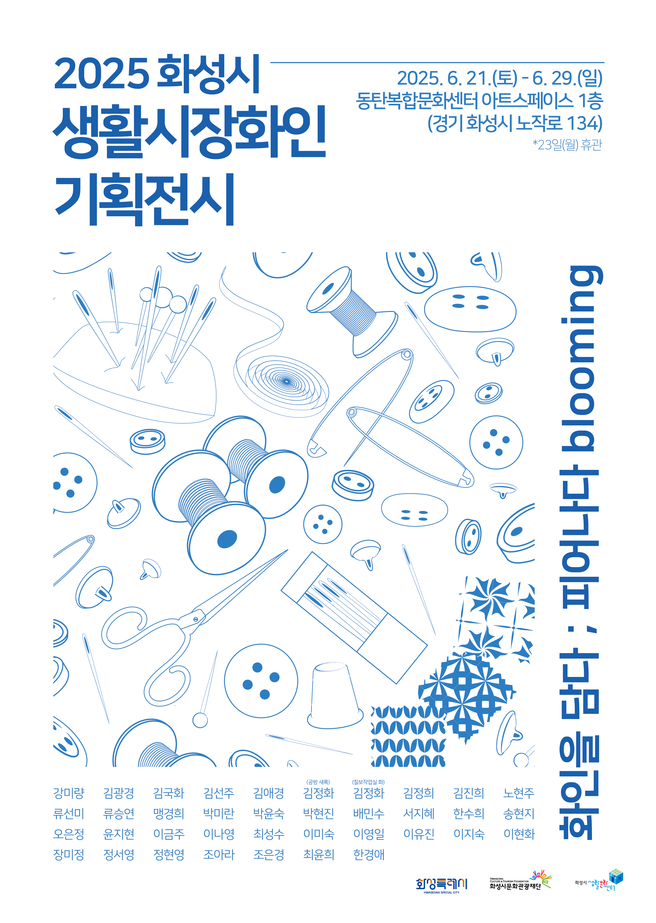 【전 시】2025 화성시 생활시장화인 기획전시 [화인을 담다: 피어나다 blooming] 장소 동탄복합문화센터 아트스페이스 기간 2025년 6월 21일 ~ 2025년 6월 29일 공연시간 티켓정보 관람등급 문의 2025년 화성시 생활시장화인 시민운영자 단체 기획전시 포스터(생활시장화인 시민운영자 단체기획전-1차).png [ Size : 955.29KB, Down : 37 ] 미리보기 다운로드 포스터(생활시장화인 시민운영자 단체기획전-1차) 목록보기