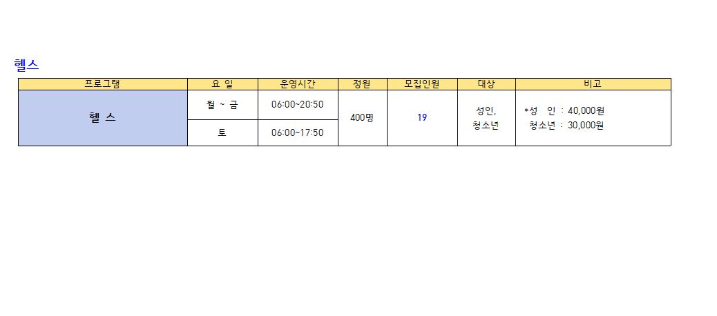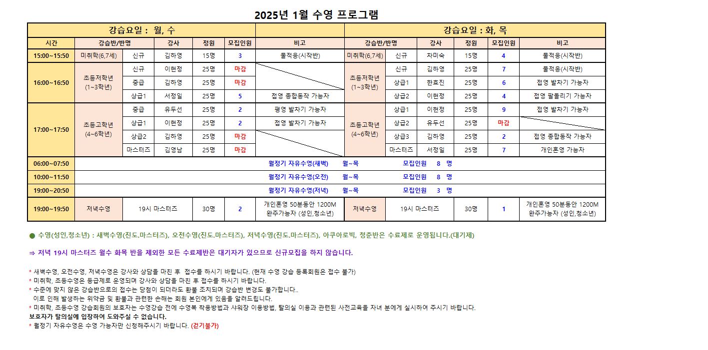 ※수영(성인,청소년) : 새벽수영(진도.마스터즈), 오전수영(진도.마스터즈), 저녁수영(진도.마스터즈), 아쿠아로빅, 청춘반은