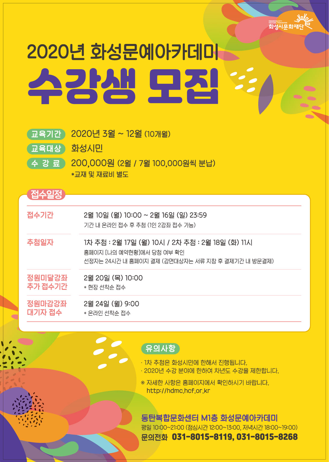 2020년 화성문예아카데미 수강접수 마감 임박 안내