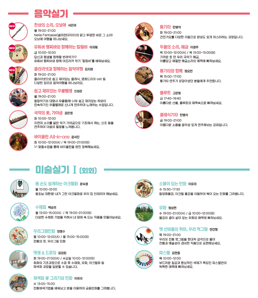 정원미달강좌 추가 접수기간 | 2월20일(목) 10:00 | 현장 선착순 접수 1인2강좌 이상 접수가능 |