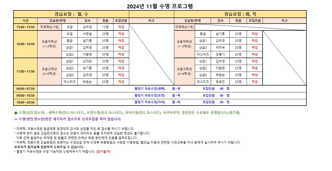 ⇒ 수영(성인,청소년)반은 대기자가 있으므로 신규모집을 하지 않습니다.