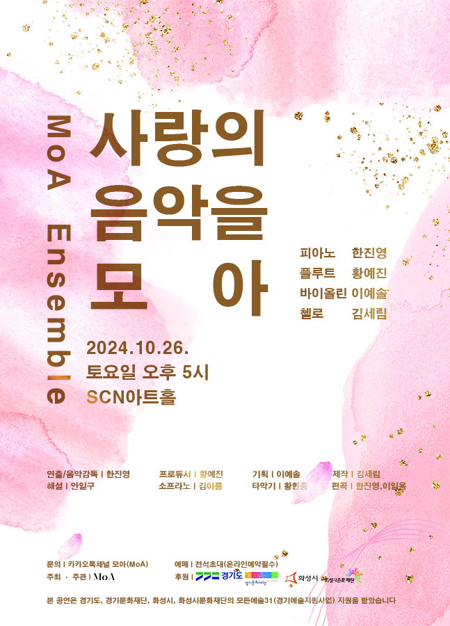 □ 단 체 명 : MoA(모아) □ 일 시 : 2024. 10. 26.(토) 오후 5시□ 장 소 : scn아트홀□ 전석 초대□ 예약 및 접수처 : 10.1(화) 활성화 예정으로 추후 업데이트 함.MoA Ensemble 사랑의 음악을 모아 피아노 한진영 플루트 황예진 바이올린 이예솔 첼로 김세림 연출/음악감독 한진영 프로듀서 황예진 이예솔 기획 제작 김세림 해설 안일구 소프라노 김아름 타악기 황현중 편곡 한진영, 이일용 문의 카카오톡 채널 모아 주최 주관 예매 (온라인예약필수) 후원 본공연은 경기도, 경기문화재단, 화성시, 화성시문화재단의 모든예술31(경기예술지원사업) 지운을 받았습니다. <2024 경기예술활동지원 모든예술31_화성>에 선정되어 경기도와 경기문화재단, 화성시, 화성시문화재단의 후원을 받아 제작되었습니다. "ㅁㅗㅇㅏ_ㅍㅗㅅㅡㅌㅓ(A4_ㅈㅏㄱㅇㅡㄴㅅㅏㅇㅣㅈㅡ)_241026_ㅅㅏㄹㅏㅇㅇㅢ_ㅇㅡㅁㅇㅏㄱㅇㅡㄹ_ㅁㅗㅇㅏ">