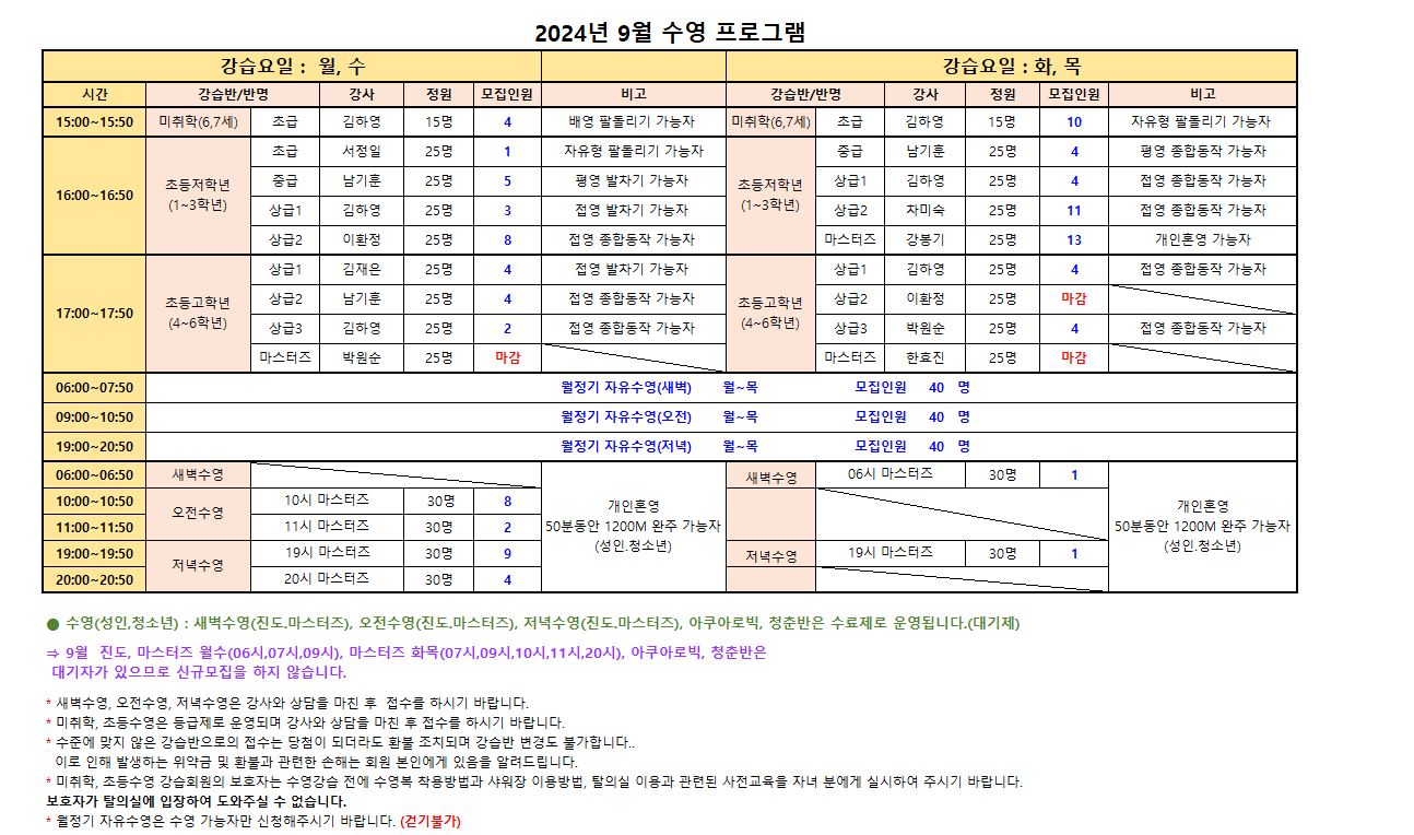 ⇒ 9월 진도 , 마스터즈 월수(06시,07시,09시), 마스터즈 화목( 07시,09시,10시,11시,20시), 아쿠아로빅, 청춘반은