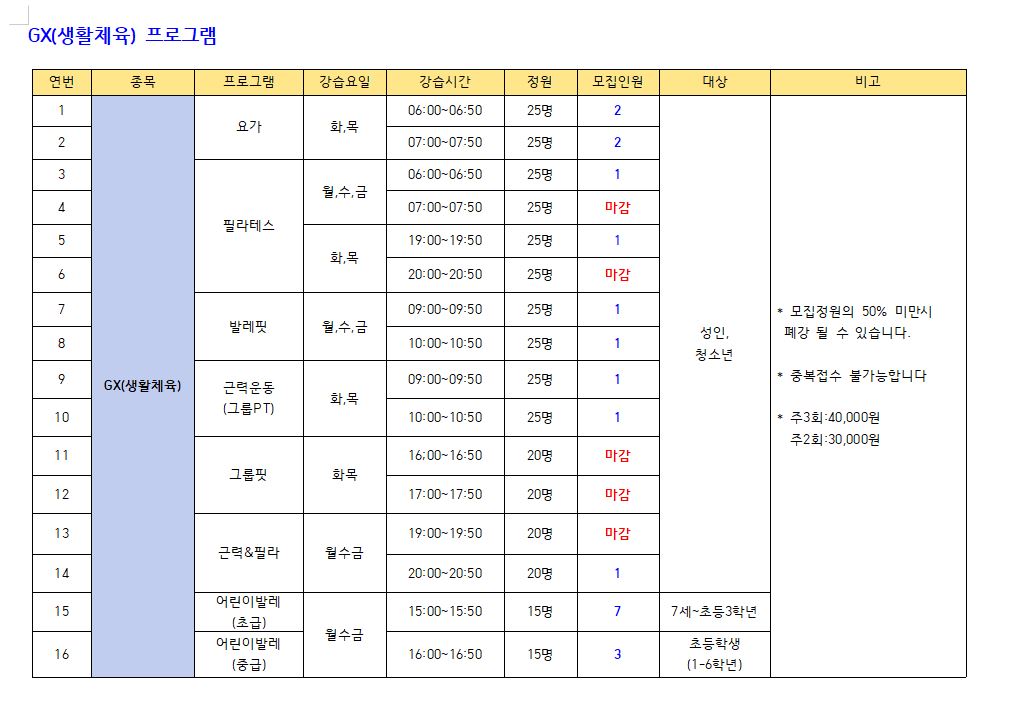 ※수영(성인,청소년) : 새벽수영(진도.마스터즈), 오전수영(진도.마스터즈), 저녁수영(진도.마스터즈), 아쿠아로빅, 청춘반은