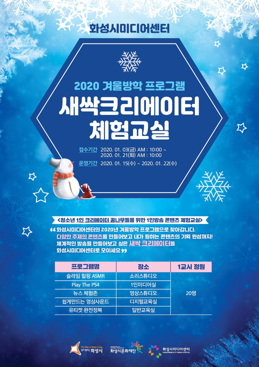 [화성시미디어센터] 2020 겨울방학특강 '새싹크리에이터 체험교실' 작성자 관리자 작성일 2020년 1월 3일 17시 50분 46초 조회 706 새싹크리에이터_전단(앞면).jpg [ Size : 1.02MB, Down : 402 ] 미리보기 다운로드 <청소년 1인 크리에이터 꿈나무들을 위한 1인방송 콘텐츠 체험교실>접수기간 : 2020.01.03 ~ 2020.01.21운영기간 : 2020.01.15 ~ 2020.01.22 목록보기