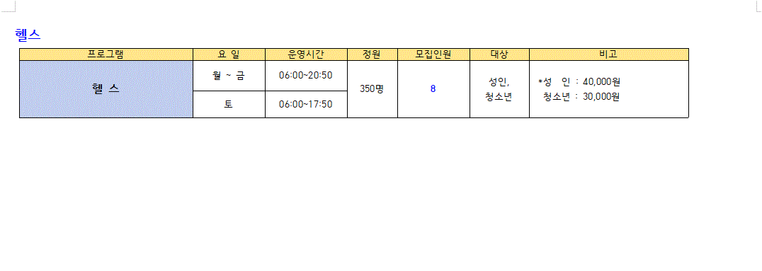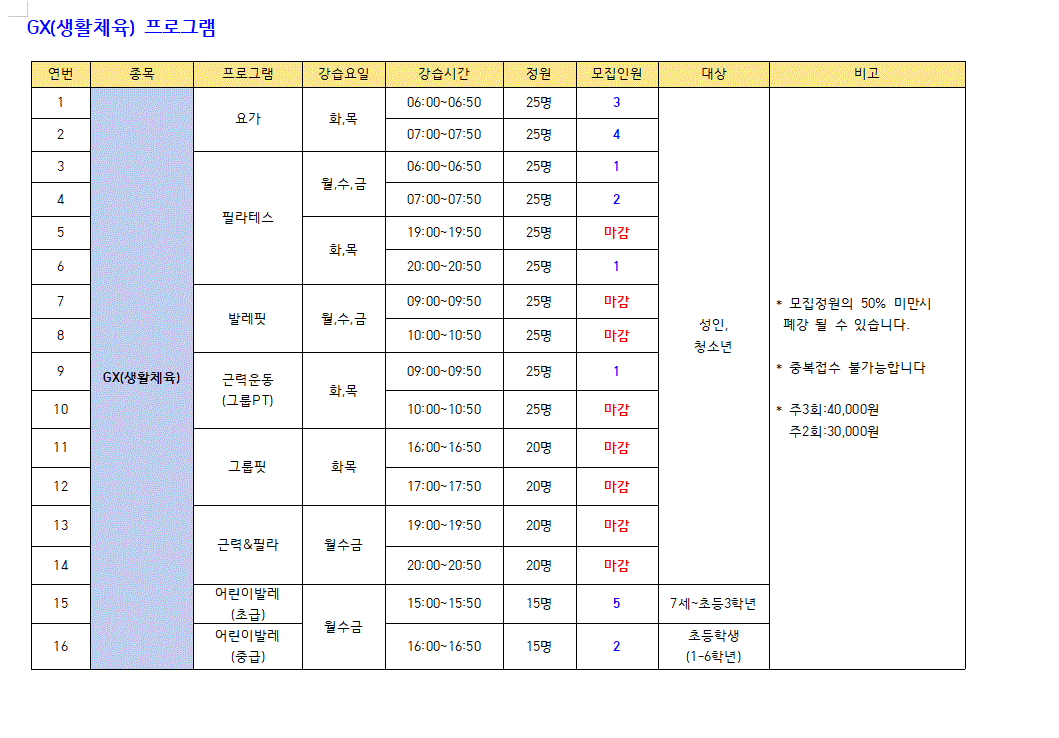 ※수영(성인,청소년) : 새벽수영(진도.마스터즈), 오전수영(진도.마스터즈), 저녁수영(진도.마스터즈), 아쿠아로빅, 청춘반은