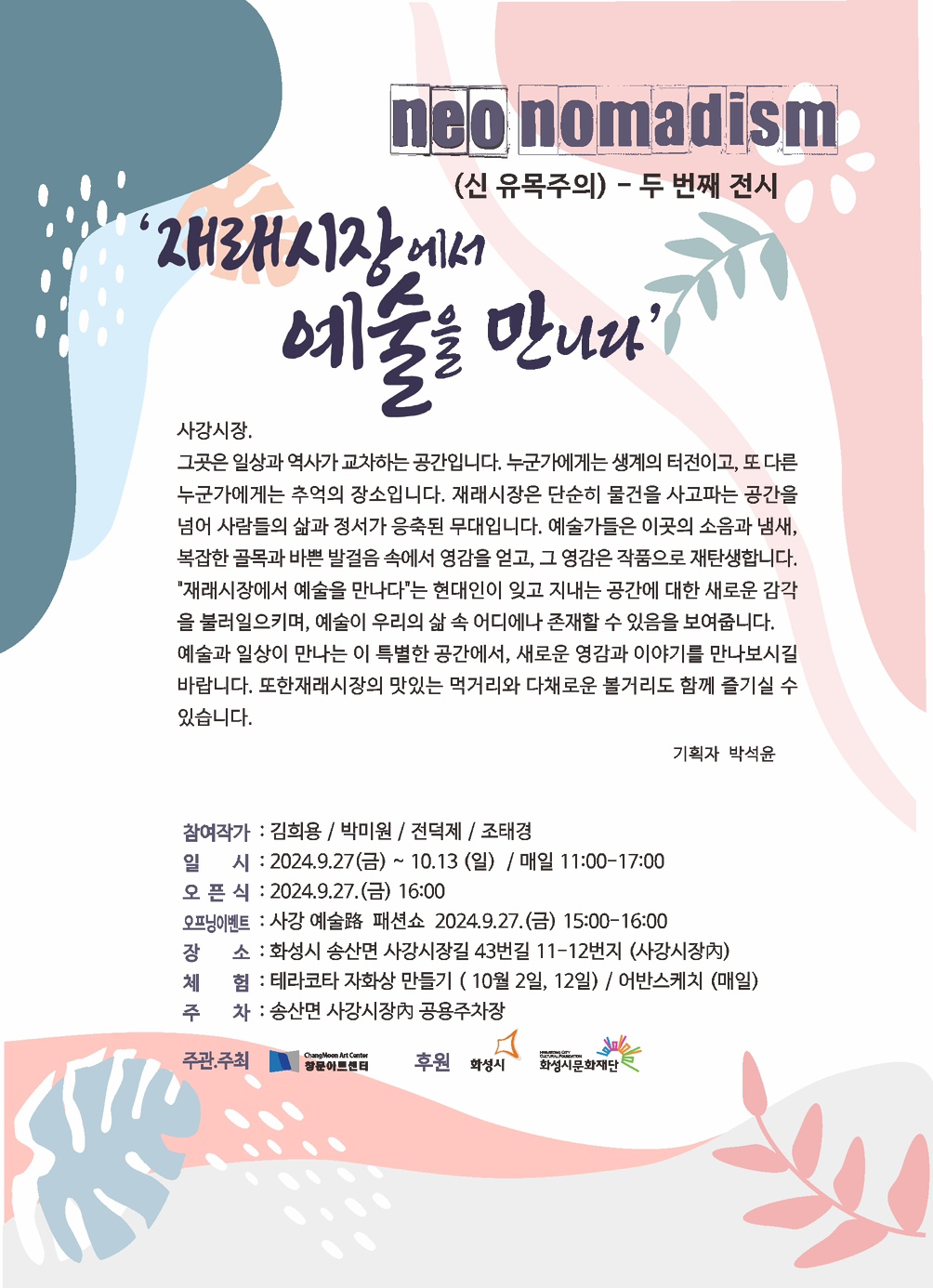 [자유공간29] Neo Nomadism (신 유목주의) - 두 번째 전시 작성자 관리자 작성일 2024년 9월 26일 17시 38분 18초 조회 474 사강시장전시초대장.jpg [ Size : 333KB, Down : 214 ] 미리보기 다운로드 사강시장전시초대장 □ 전시명 : Neo Nomadism(신 유목주의) - 두 번째 전시 □ 참여작가 : 김희용 / 박미원 / 전덕제 / 조태경 □ 장소 : 화성시 송산면 사강시장길 43번길 11-12번지(사강시장 內) □ 일시 : 2024.9.27.(금) ~ 10.13.(일) 목록보기