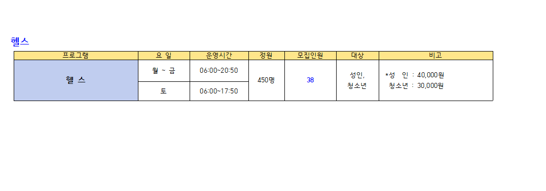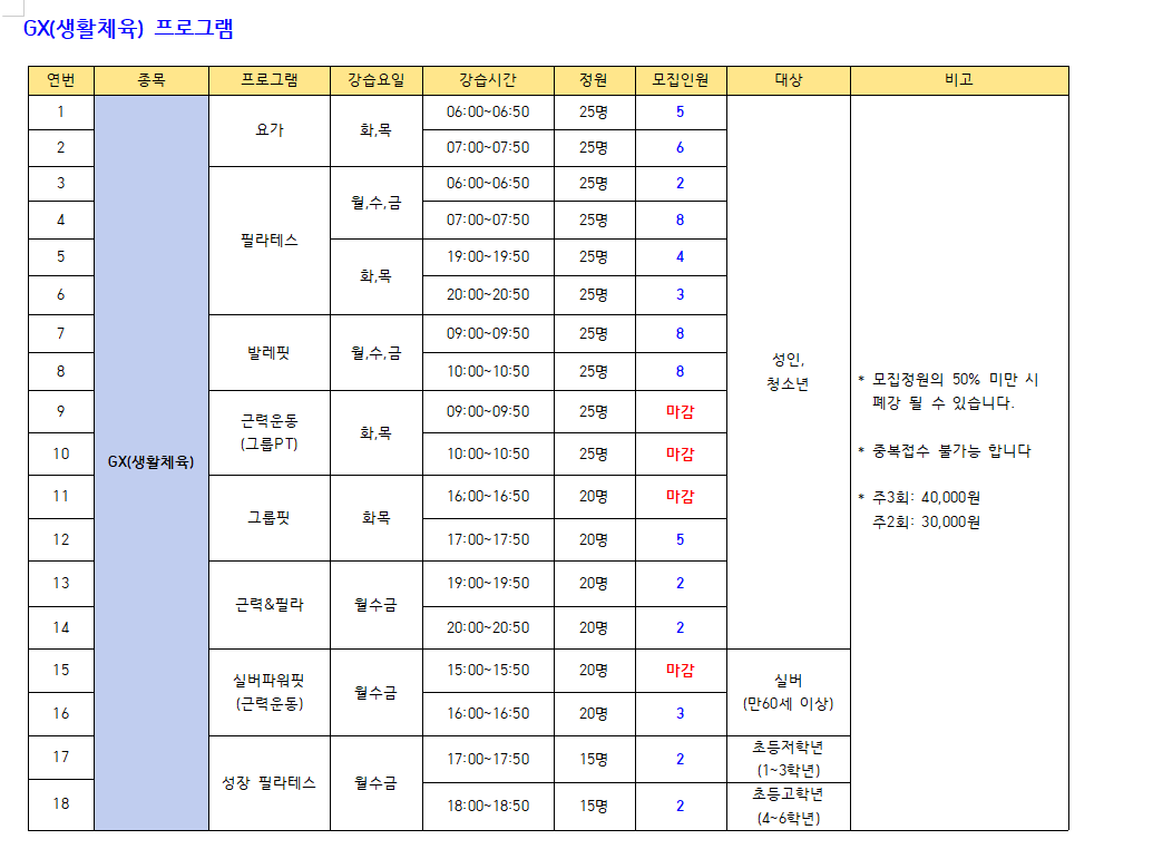 ● 수영(성인,청소년) : 새벽수영(진도.마스터즈), 오전수영(진도.마스터즈), 저녁수영(진도.마스터즈), 아쿠아로빅, 청춘반은