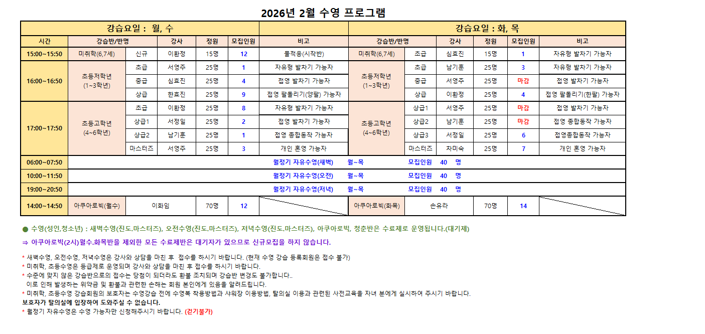 *미취학, 초등수영은 등급제로 운영되며 반드시 강사와 상담을 마친 후 접수를 하시기 바랍니다.