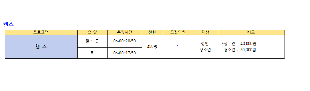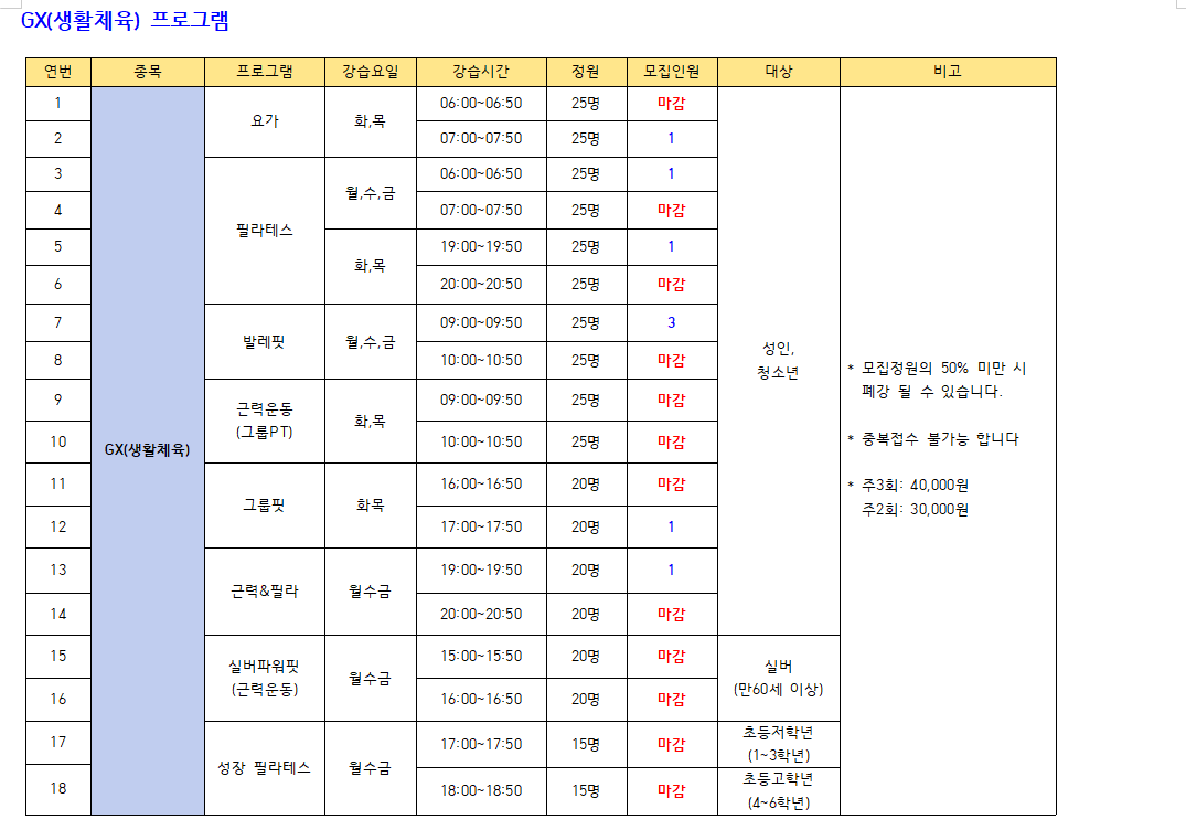 ※수영(성인,청소년) : 새벽수영(진도.마스터즈), 오전수영(진도.마스터즈), 저녁수영(진도.마스터즈), 아쿠아로빅, 청춘반은