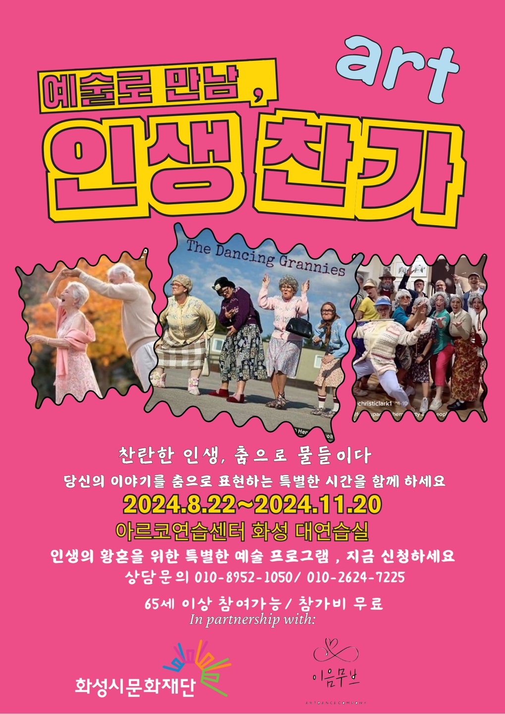 예술로 만남, 인생찬가 | 8/22(목) 10:00~12:00 * 자세한 일정은 포스터 참고 | 65세 이상 노인 | 아르코연습센터 화성 대연습실(동탄) | 서로의 감정을 나누며 자신의 감정을 춤으로 표현하는 공연 |
