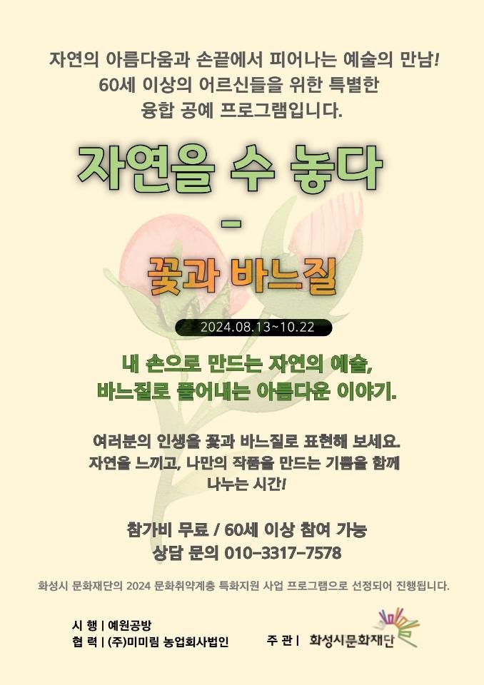 자연을 수놓다 -꽃과 바느질 | 8/13(화) 9:00~12:00 이후 매주(화) 10회차 | 60세 이상 노인 | 미미림 농업회사법인(향남읍) | 바느질 공예와 자연물을 결합한 창의적 활동 및 작품제작 |