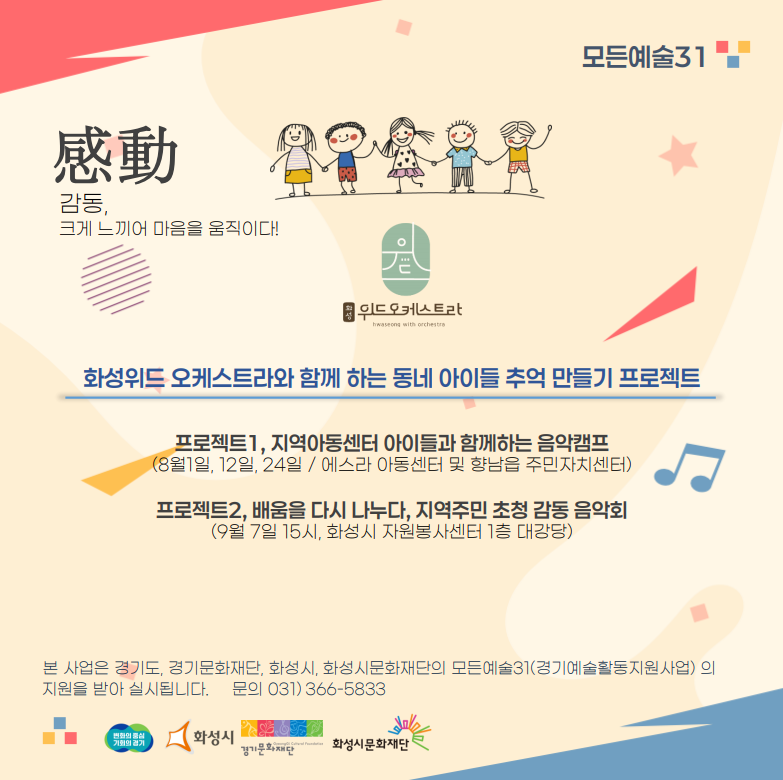 [2024년 모든예술31-화성] 9.7.(토) 16:00 화성위드오케스트라 <지역주민 초청 '감동'음악회> 작성자 관리자 작성일 2024년 8월 24일 14시 30분 52초 조회 482 photo_1.PNG [ Size : 1.62MB, Down : 79 ] 미리보기 다운로드 photo_1 photo_0.PNG [ Size : 146.41KB, Down : 112 ] 미리보기 다운로드 photo_0 2024 경기예술활동지원 모든예술31_화성 선정작화성위드 오케스트라 _ 지역주민 초천 '감동'음악회□ 공연명 : <지역주민 초청 '감동' 음악회>□ 단체명 : 화성위드오케스트라□ 일 시 : 2024. 9. 7.(토) 16:00□ 장 소 : 화성시자원봉사센터 1층 대강당□ 자유관람 <2024 경기예술활동지원 모든예술31_화성>에 선정되어 경기도와 경기문화재단, 화성시, 화성시문화재단의 후원을 받아 제작되었습니다. 목록보기