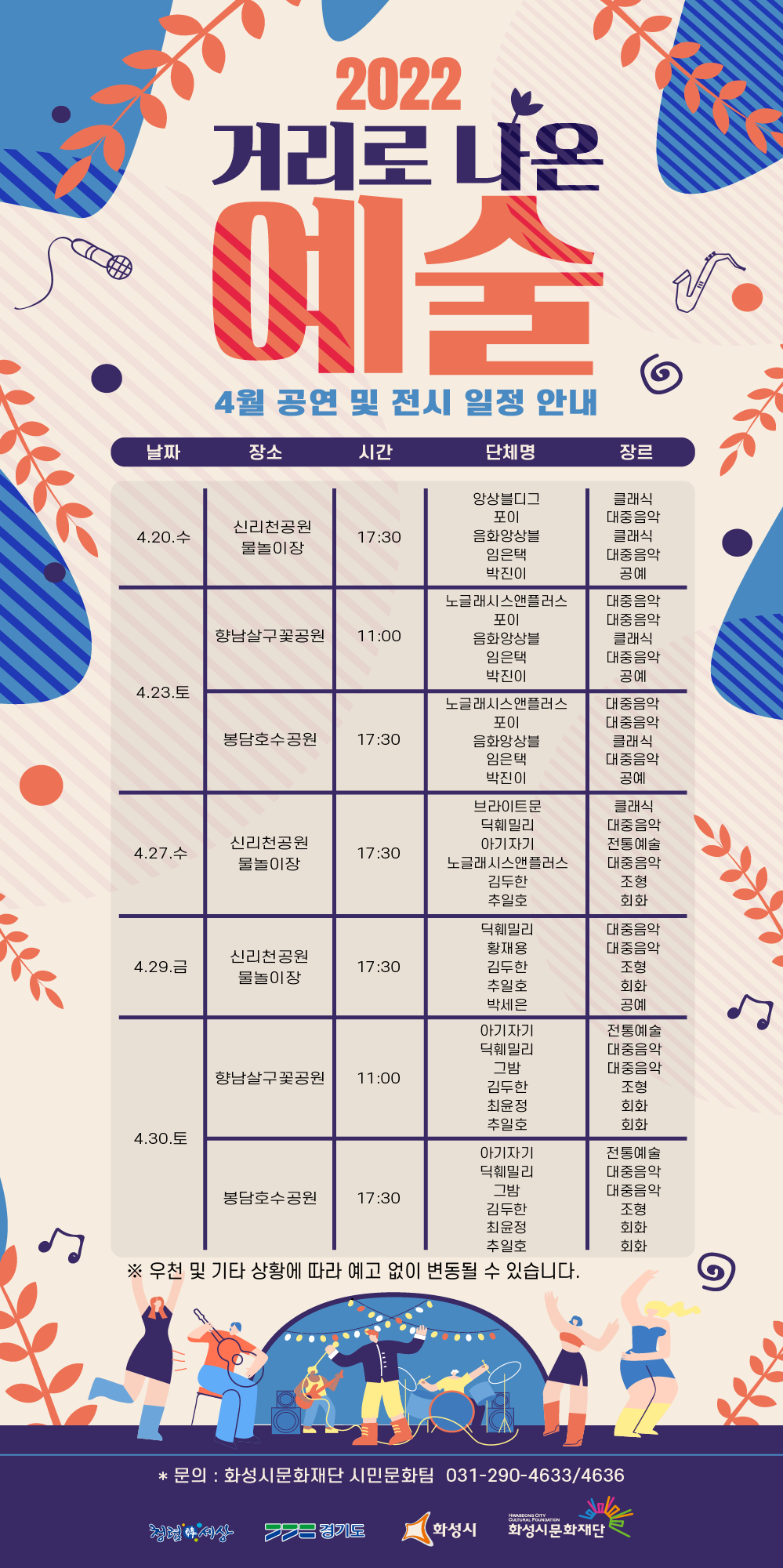 2022 거리로 나온 예술 공연일정 안내 (4월) 작성자 관리자 작성일 2022년 4월 19일 17시 22분 0초 조회 831 거리로 나온 예술 4월 일정안내.png [ Size : 381.8KB, Down : 786 ] 미리보기 다운로드 거리로 나온 예술 4월 일정안내 2022 거리로 나온 예술 공연일정 안내 2022 거리로 나온 예술은 생활예술인 및 전문예술인에게 거리예술 참여 기회를 제공하고 누구나 거리에서 다양한 문화예술을 향유할 수 있도록 하기 위한 사업입니다. 목록보기