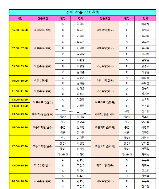 [스포츠] 수영 강습 강사 현황 작성자 관리자 작성일 2025년 12월 31일 11시 35분 32초 조회 855 수영강습 강사현황 .png [ Size : 47.96KB, Down : 273 ] 미리보기 다운로드 수영강습 강사현황 목록보기